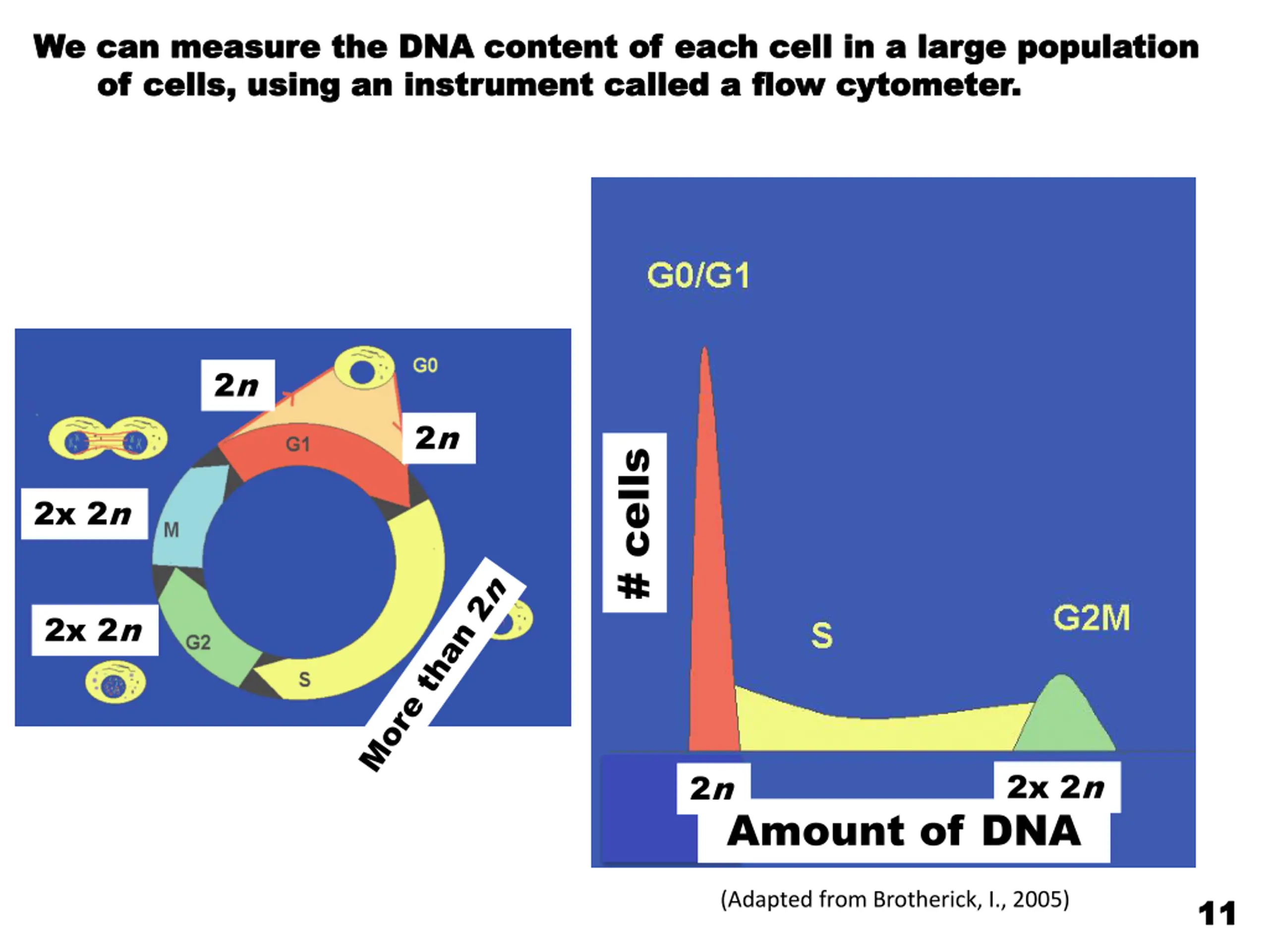 We can measure the DNA content of each cell in a large population We can measure the DNA content of each cell in a large population of cells, using an instrument called a flow cytometer. of cells, using an instrument called a flow cytometer. 2n 2n # cells 2x 2n 2x 2n 2x 2n 2n Amount of DNA (Adapted from Brotherick, I., 2005) 11 11