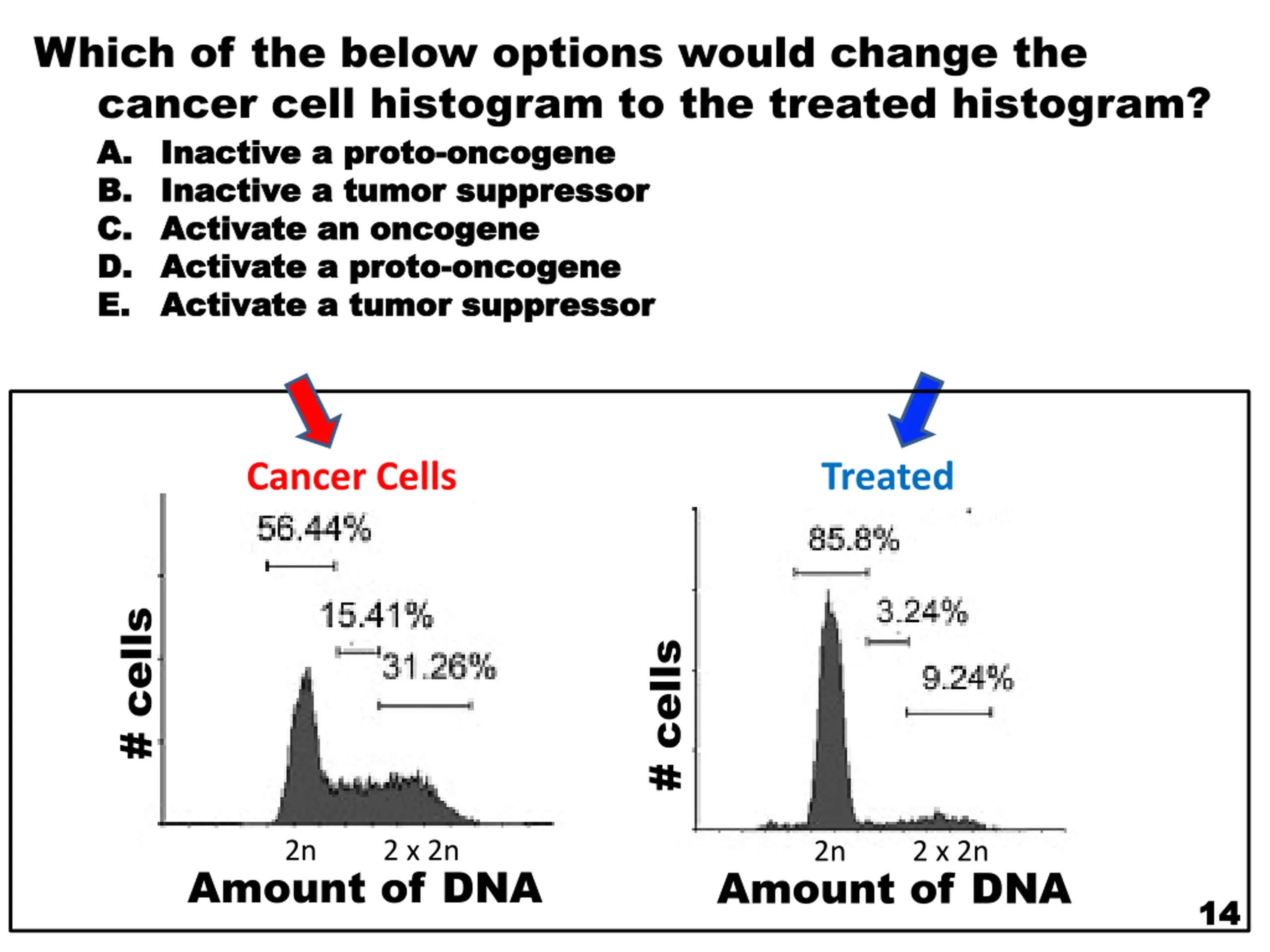 Which of the below options would change the cancer cell histogram to the treated histogram? A. A. Inactive a proto Inactive a proto- -oncogene B. B. Inactive a tumor suppressor Inactive a tumor suppressor C. C. Activate an oncogene Activate an oncogene D. D. Activate a proto Activate a proto- -oncogene E. E. Activate a tumor suppressor Activate a tumor suppressor oncogene oncogene Cancer Cells Treated # cells # cells 2n 2 x 2n 2n 2 x 2n Amount of DNA Amount of DNA 14 14