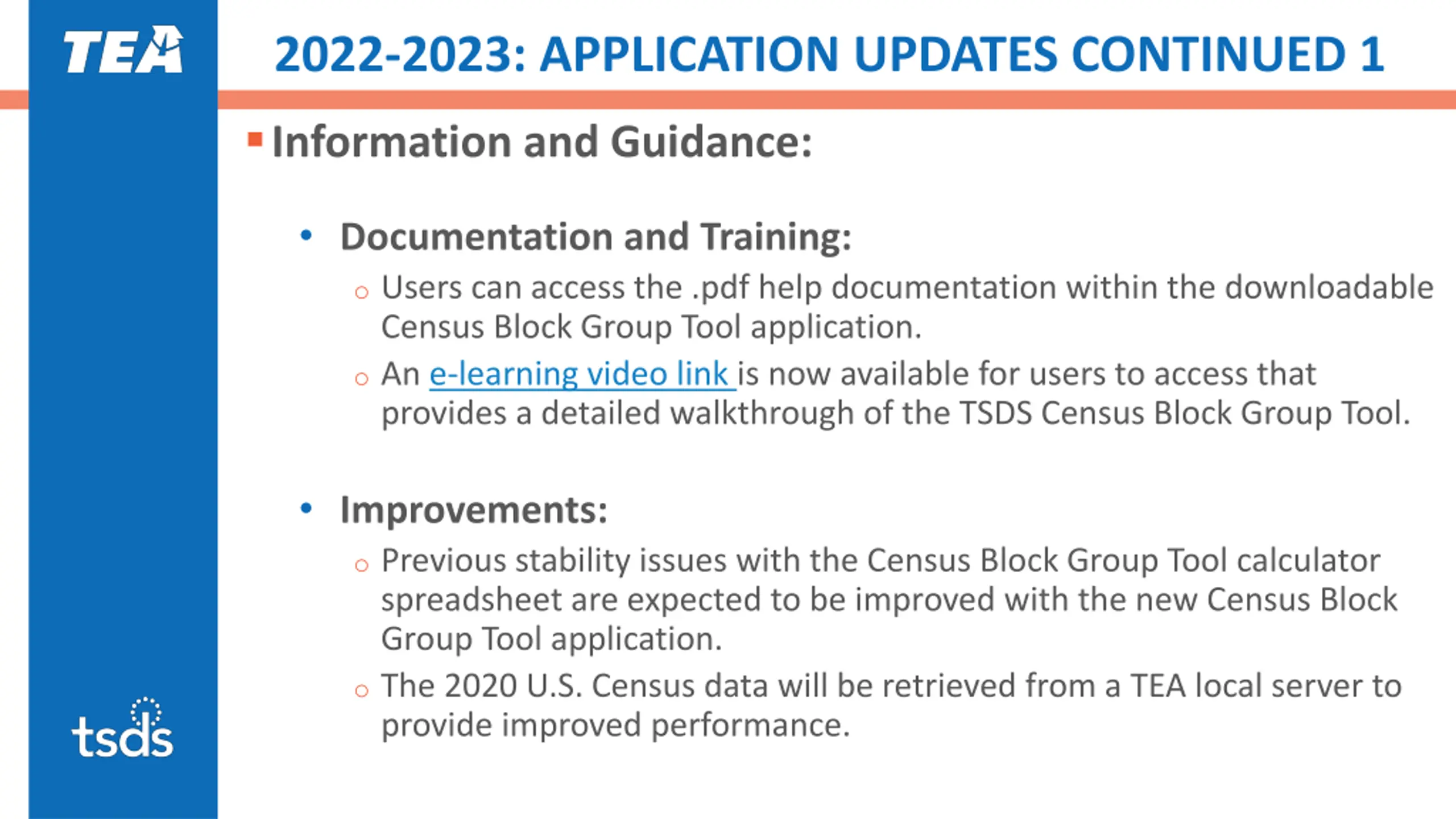 2022-2023: APPLICATION UPDATES CONTINUED 1 Information and Guidance: Documentation and Training: o Users can access the .pdf help documentation within the downloadable Census Block Group Tool application. o An e-learning video link is now available for users to access that provides a detailed walkthrough of the TSDS Census Block Group Tool. Improvements: o Previous stability issues with the Census Block Group Tool calculator spreadsheet are expected to be improved with the new Census Block Group Tool application. o The 2020 U.S. Census data will be retrieved from a TEA local server to provide improved performance.