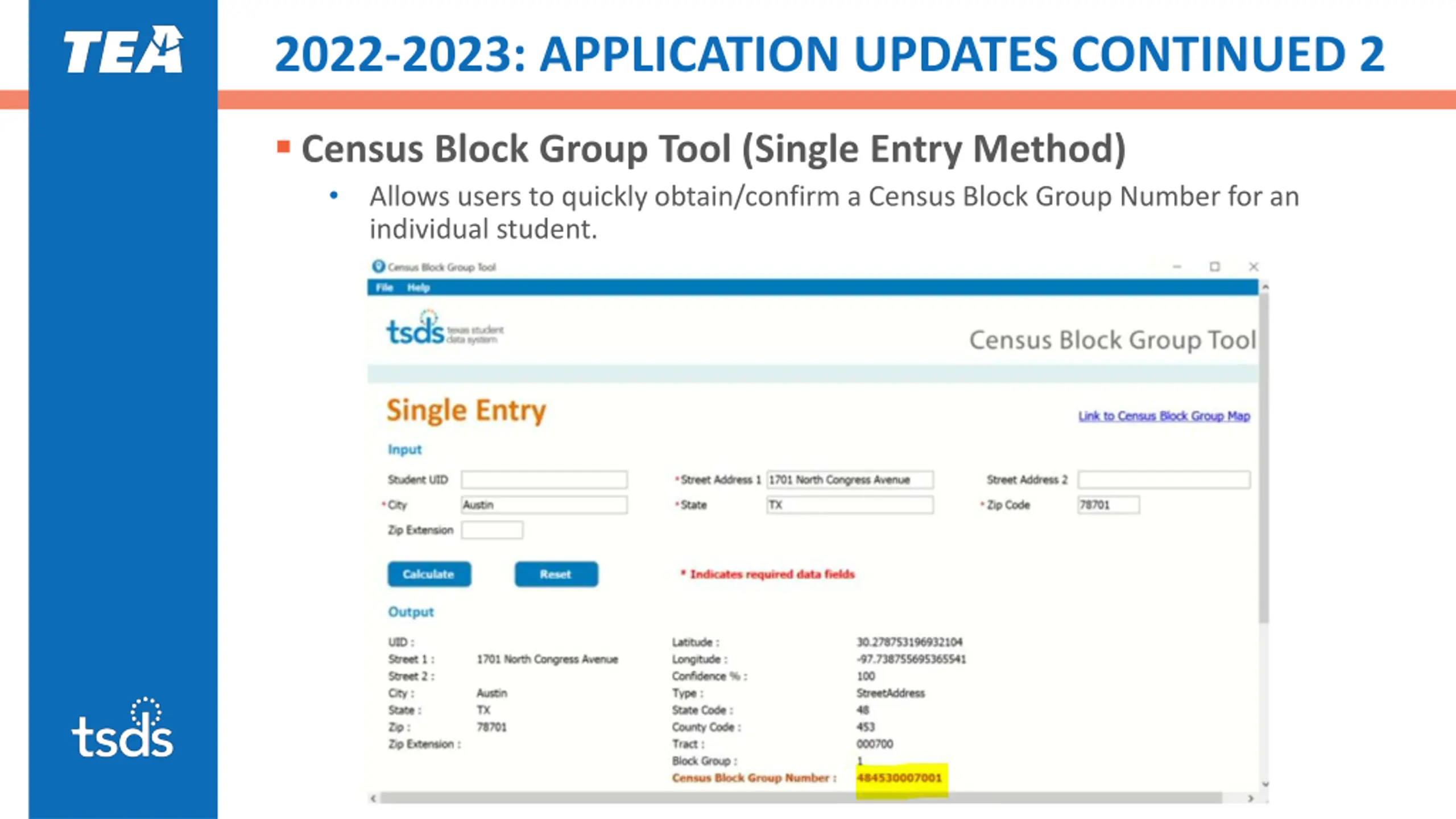2022-2023: REMINDERS The census block group number is collected in the PEIMS Fall submission on the StudentExtension complex type