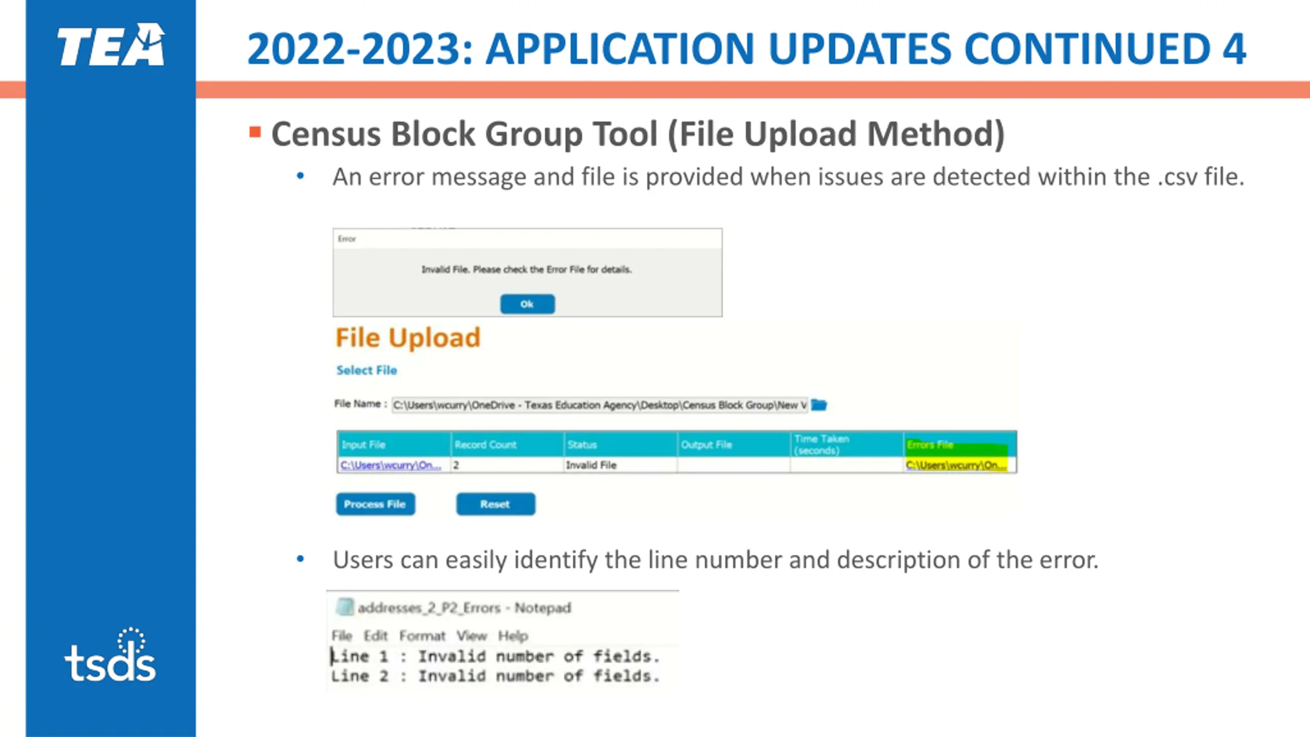 2022-2023: APPLICATION UPDATES CONTINUED 4 Census Block Group Tool (File Upload Method) An error message and file is provided when issues are detected within the .csv file. Users can easily identify the line number and description of the error.
