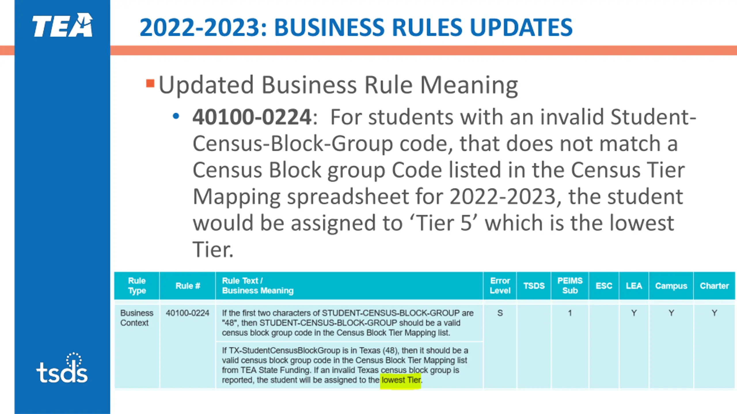 2022-2023: BUSINESS RULES UPDATES Updated Business Rule Meaning 40100-0224: For students with an invalid Student- Census-Block-Group code, that does not match a Census Block group Code listed in the Census Tier Mapping spreadsheet for 2022-2023, the student would be assigned to Tier 5 which is the lowest Tier.