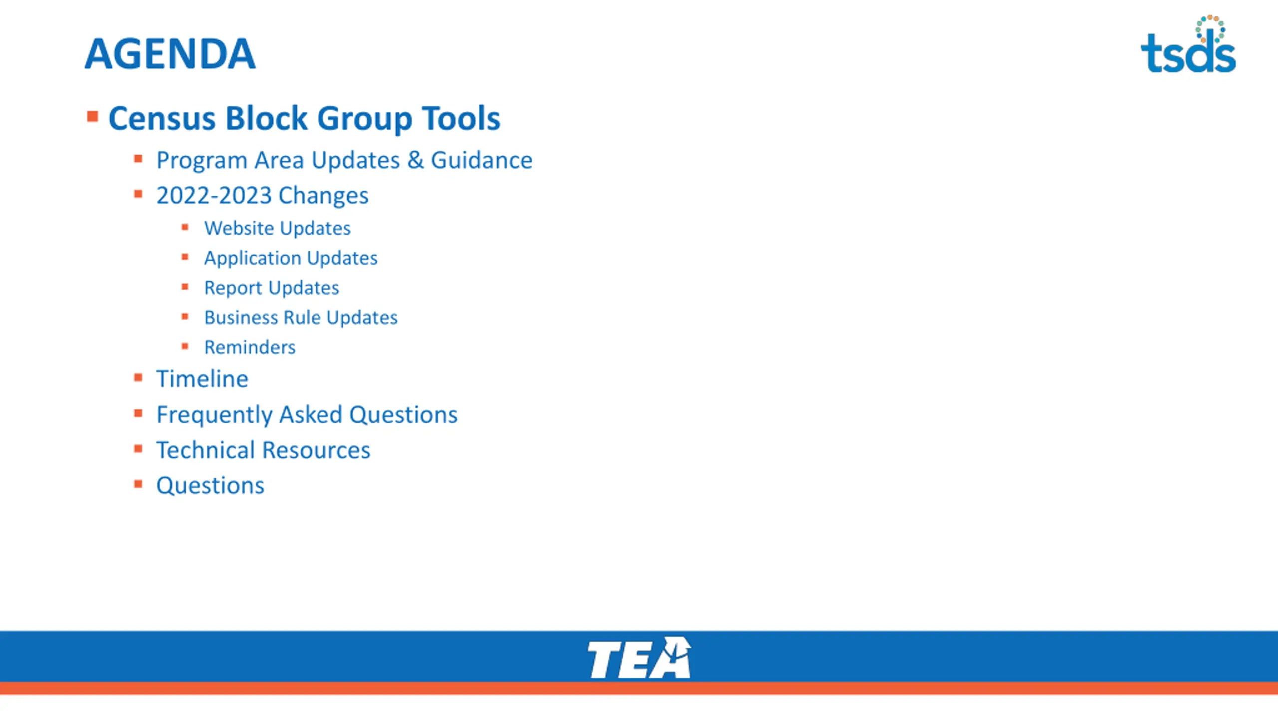 AGENDA Census Block Group Tools Program Area Updates & Guidance 2022-2023 Changes Website Updates Application Updates Report Updates Business Rule Updates Reminders Timeline Frequently Asked Questions Technical Resources Questions