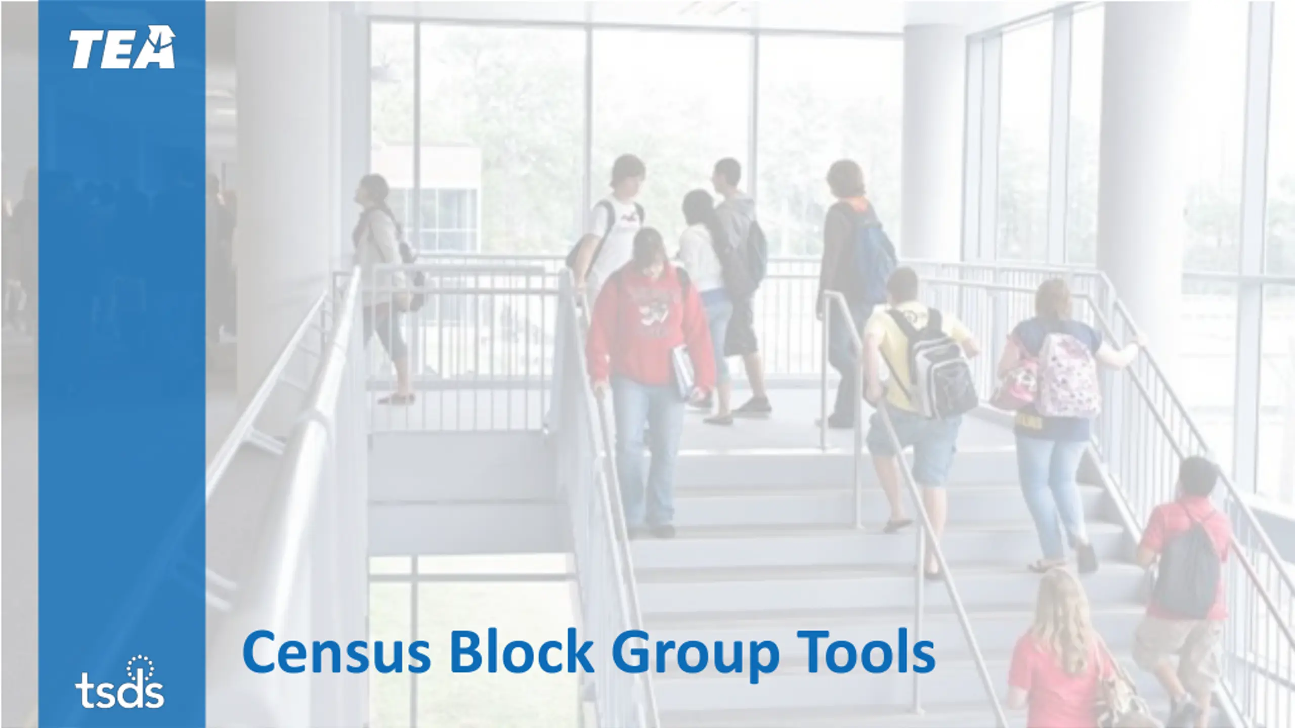 TECHNICAL RESOURCES Technical Support: TSDSCustomerSupport@tea.texas.gov Instructions/Documentation: Census Block Group Tools Training: Census Block Group Tools e-learning video link Knowledge Base Articles: TSDSKB-595 Census Block Group Number Information / FAQs