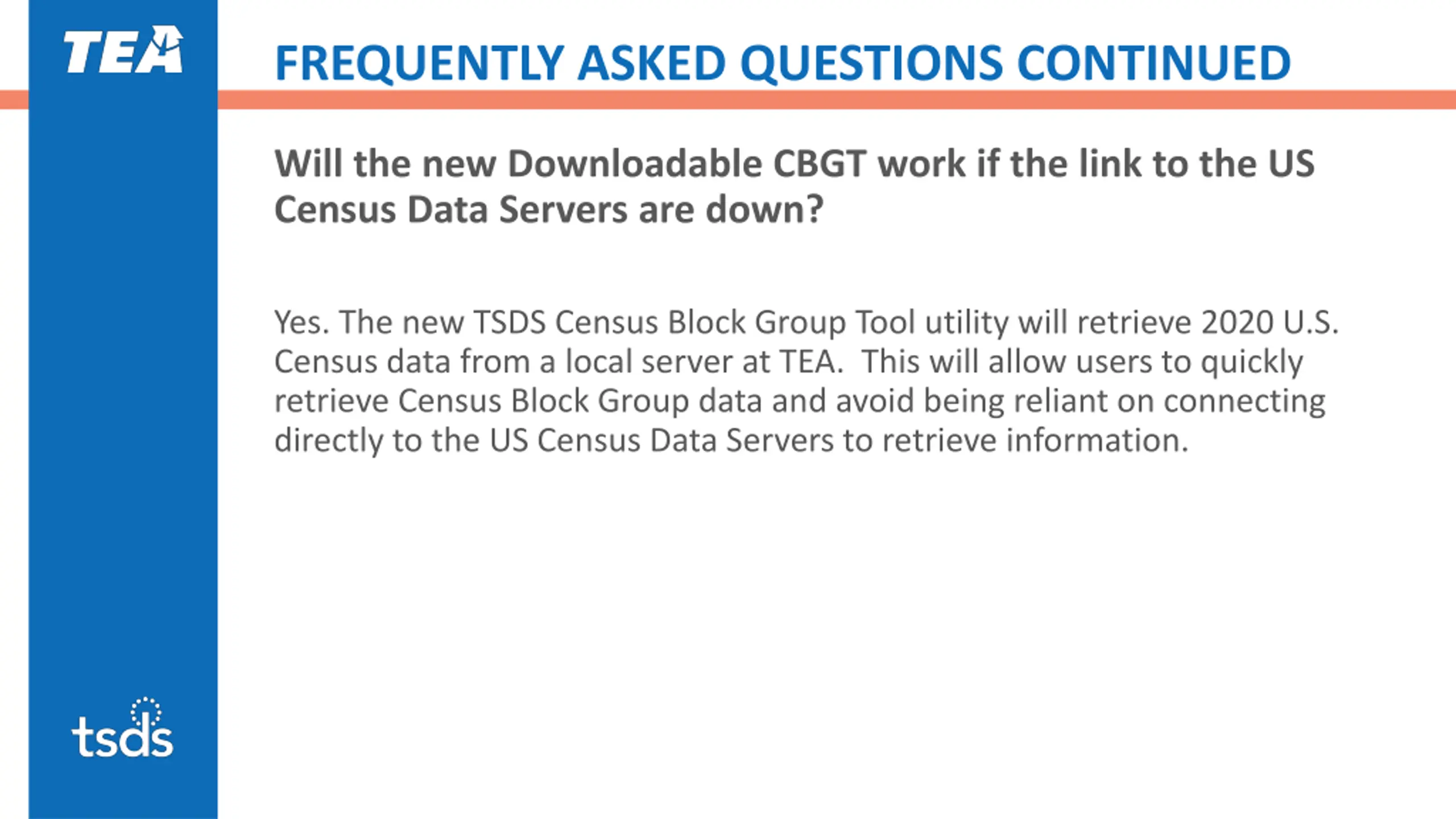 FREQUENTLY ASKED QUESTIONS CONTINUED Will the new Downloadable CBGT work if the link to the US Census Data Servers are down? Yes. The new TSDS Census Block Group Tool utility will retrieve 2020 U.S. Census data from a local server at TEA. This will allow users to quickly retrieve Census Block Group data and avoid being reliant on connecting directly to the US Census Data Servers to retrieve information.