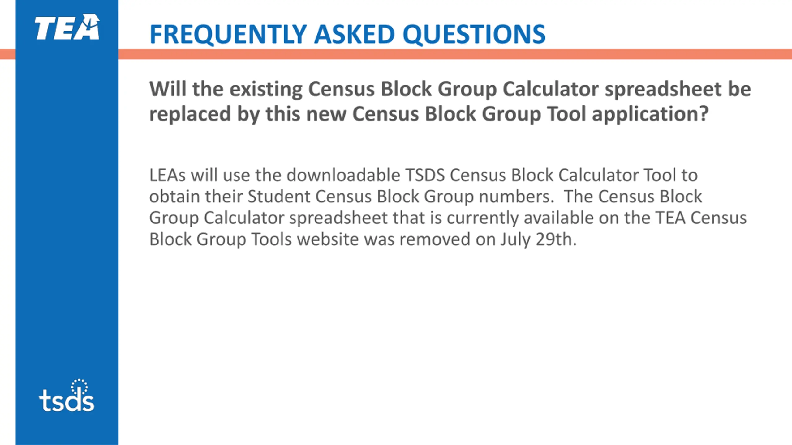 FREQUENTLY ASKED QUESTIONS Will the existing Census Block Group Calculator spreadsheet be replaced by this new Census Block Group Tool application? LEAs will use the downloadable TSDS Census Block Calculator Tool to obtain their Student Census Block Group numbers. The Census Block Group Calculator spreadsheet that is currently available on the TEA Census Block Group Tools website was removed on July 29th.