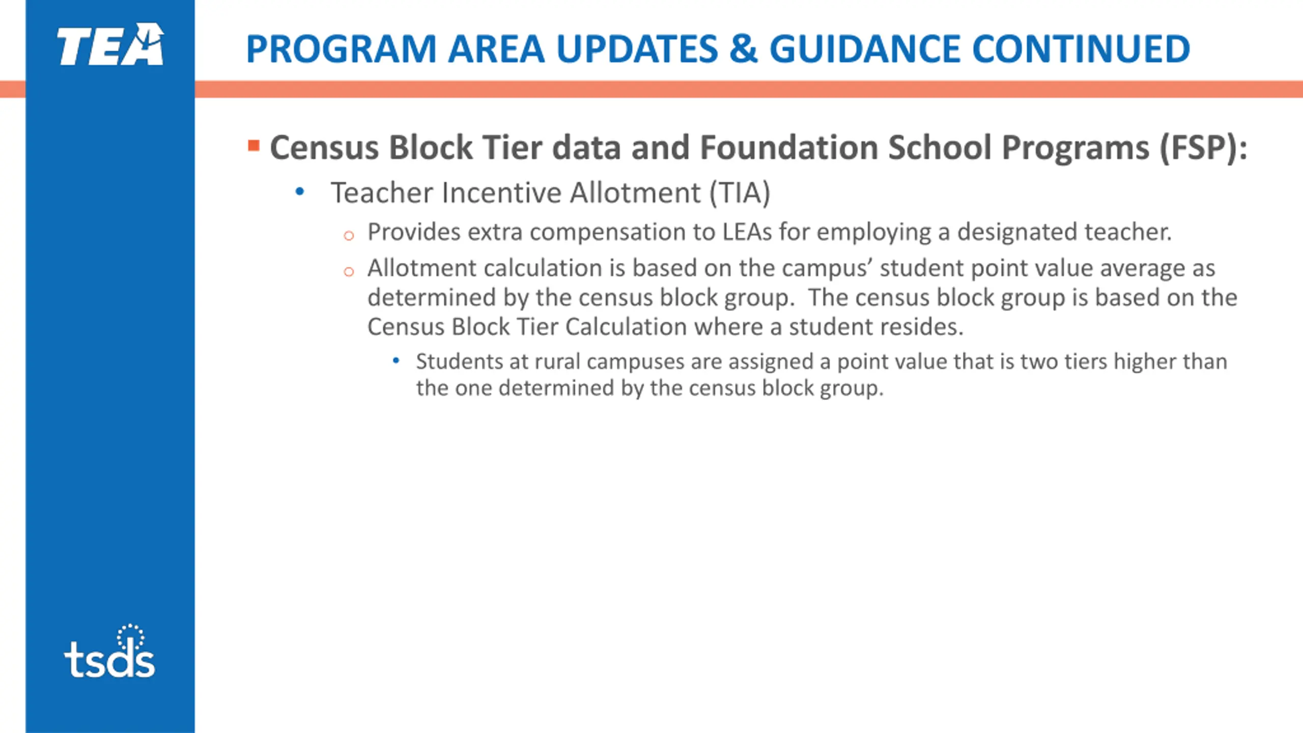 PROGRAM AREA UPDATES & GUIDANCE CONTINUED Census Block Tier data and Foundation School Programs (FSP): Teacher Incentive Allotment (TIA) o Provides extra compensation to LEAs for employing a designated teacher. o Allotment calculation is based on the campus student point value average as determined by the census block group. The census block group is based on the Census Block Tier Calculation where a student resides. Students at rural campuses are assigned a point value that is two tiers higher than the one determined by the census block group.