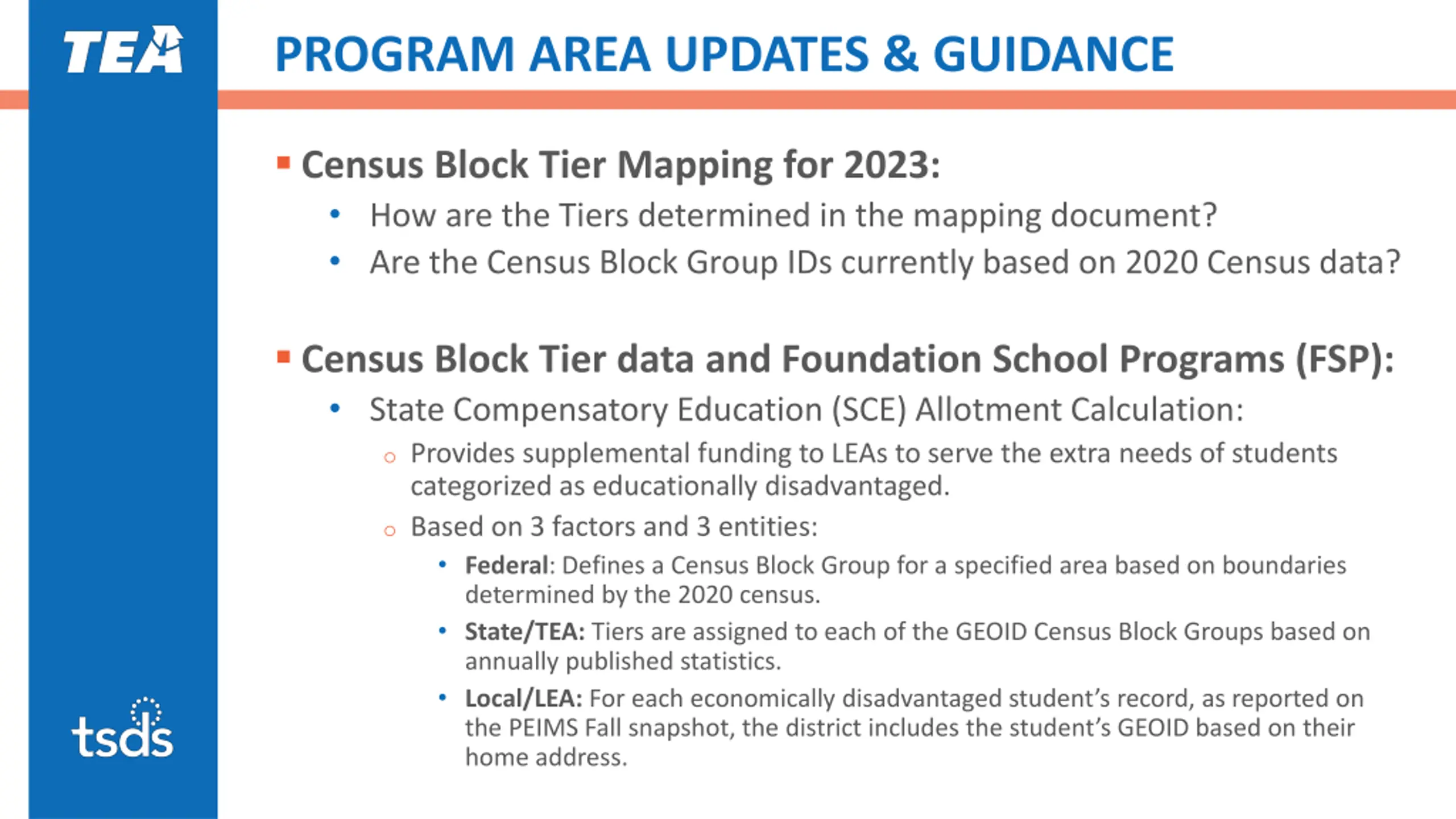 PROGRAM AREA UPDATES & GUIDANCE Census Block Tier Mapping for 2023: How are the Tiers determined in the mapping document? Are the Census Block Group IDs currently based on 2020 Census data? Census Block Tier data and Foundation School Programs (FSP): State Compensatory Education (SCE) Allotment Calculation: o Provides supplemental funding to LEAs to serve the extra needs of students categorized as educationally disadvantaged. o Based on 3 factors and 3 entities: Federal: Defines a Census Block Group for a specified area based on boundaries determined by the 2020 census. State/TEA: Tiers are assigned to each of the GEOID Census Block Groups based on annually published statistics. Local/LEA: For each economically disadvantaged student s record, as reported on the PEIMS Fall snapshot, the district includes the student s GEOID based on their home address.