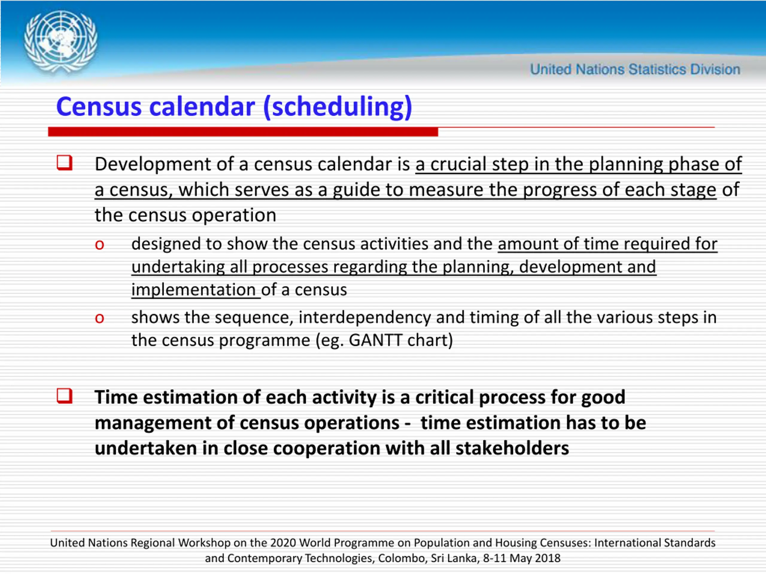 Census calendar (scheduling) Development of a census calendar is a crucial step in the planning phase of a census, which serves as a guide to measure the progress of each stage of the census operation o designed to show the census activities and the amount of time required for undertaking all processes regarding the planning, development and implementation of a census o shows the sequence, interdependency and timing of all the various steps in the census programme (eg. GANTT chart) Time estimation of each activity is a critical process for good management of census operations - time estimation has to be undertaken in close cooperation with all stakeholders United Nations Regional Workshop on the 2020 World Programme on Population and Housing Censuses: International Standards and Contemporary Technologies, Colombo, Sri Lanka, 8-11 May 2018