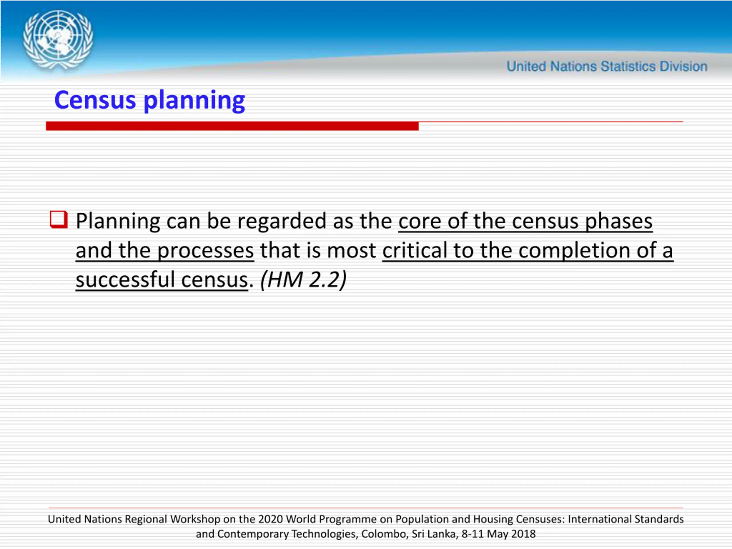 Census planning Planning can be regarded as the core of the census phases and the processes that is most critical to the completion of a successful census. (HM 2.2) United Nations Regional Workshop on the 2020 World Programme on Population and Housing Censuses: International Standards and Contemporary Technologies, Colombo, Sri Lanka, 8-11 May 2018