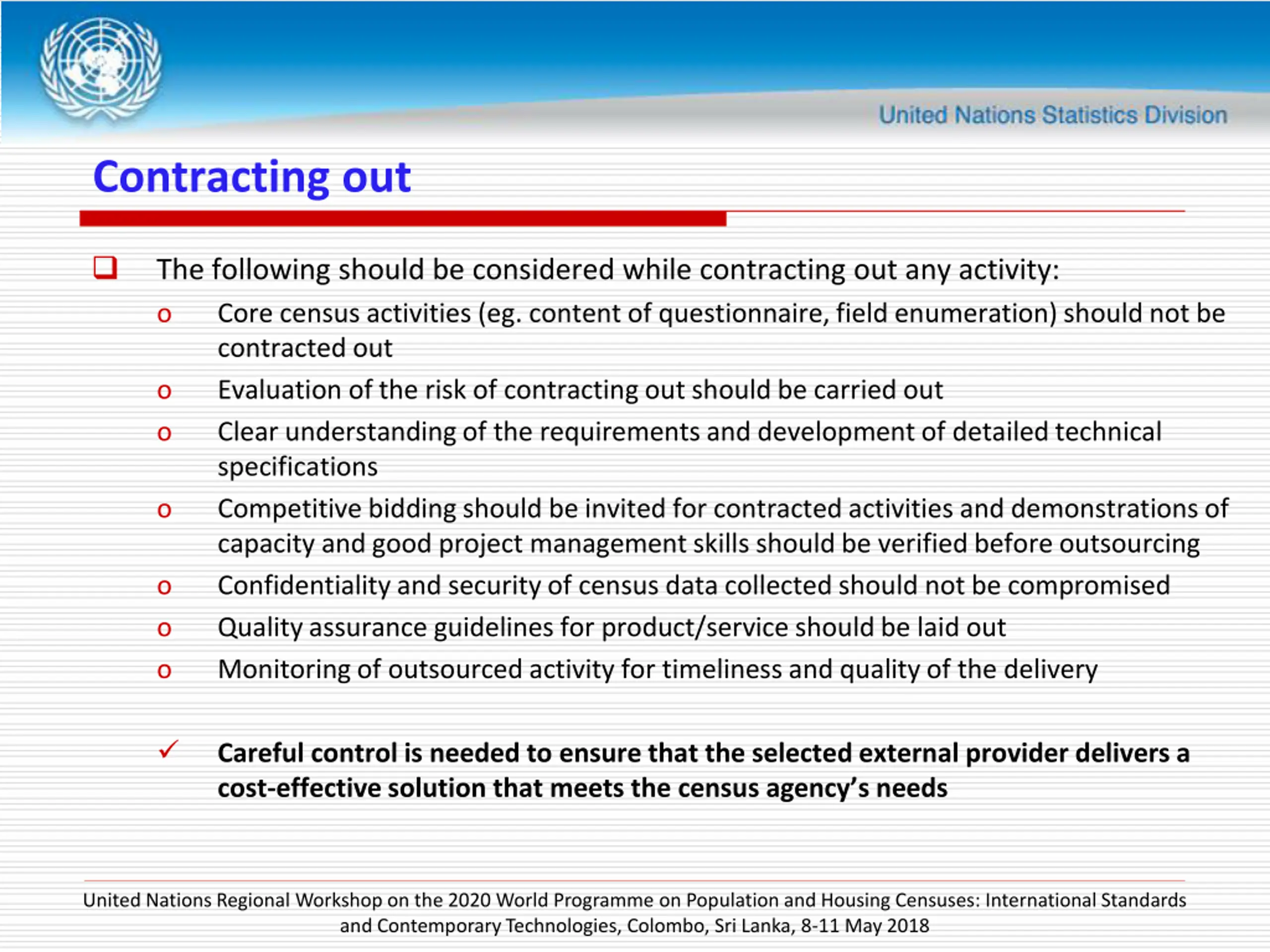 Contracting out The following should be considered while contracting out any activity: o Core census activities (eg. content of questionnaire, field enumeration) should not be contracted out o Evaluation of the risk of contracting out should be carried out o Clear understanding of the requirements and development of detailed technical specifications o Competitive bidding should be invited for contracted activities and demonstrations of capacity and good project management skills should be verified before outsourcing o Confidentiality and security of census data collected should not be compromised o Quality assurance guidelines for product/service should be laid out o Monitoring of outsourced activity for timeliness and quality of the delivery Careful control is needed to ensure that the selected external provider delivers a cost effective solution that meets the census agency s needs United Nations Regional Workshop on the 2020 World Programme on Population and Housing Censuses: International Standards and Contemporary Technologies, Colombo, Sri Lanka, 8-11 May 2018