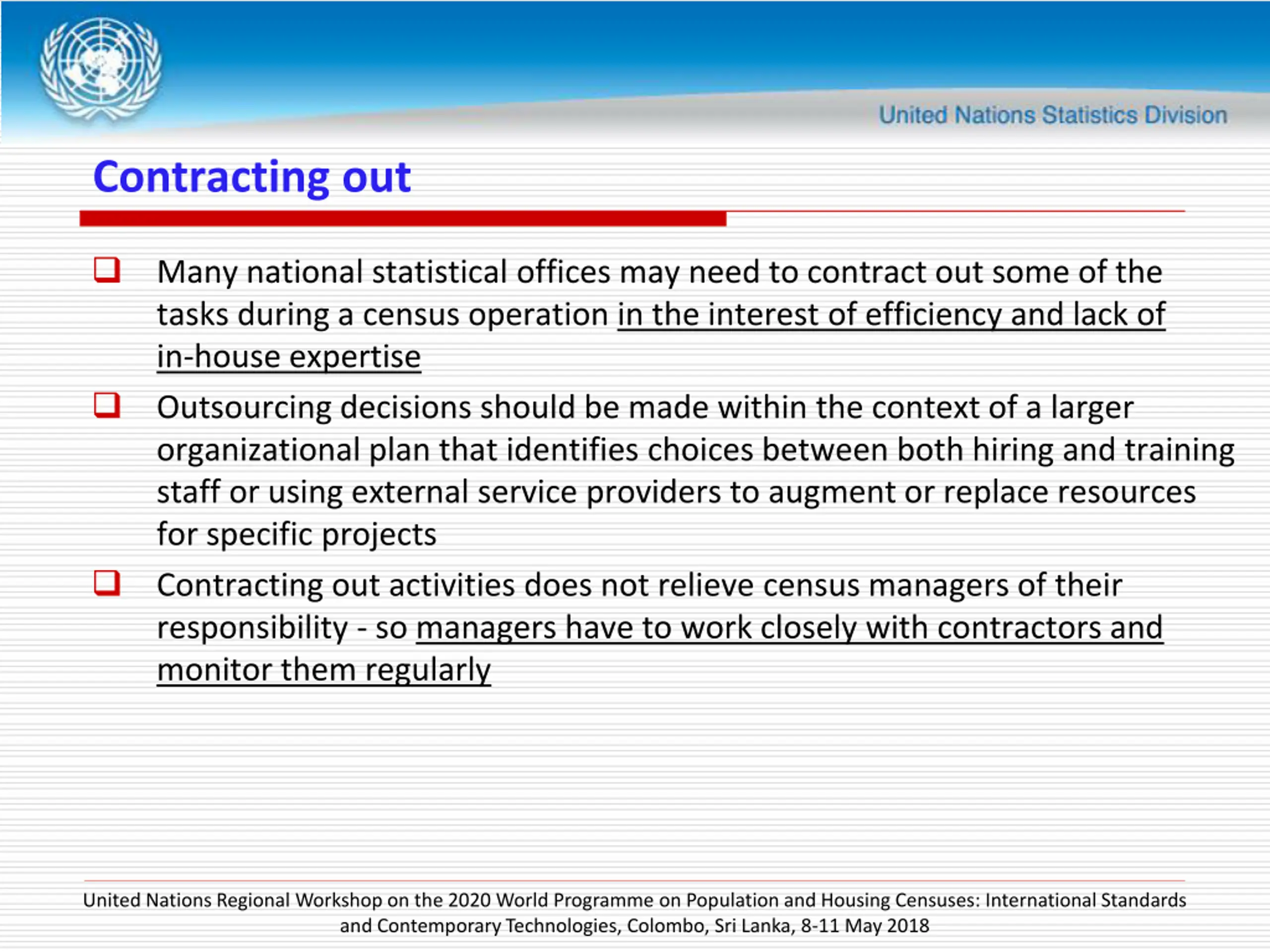 Contracting out Many national statistical offices may need to contract out some of the tasks during a census operation in the interest of efficiency and lack of in house expertise Outsourcing decisions should be made within the context of a larger organizational plan that identifies choices between both hiring and training staff or using external service providers to augment or replace resources for specific projects Contracting out activities does not relieve census managers of their responsibility - so managers have to work closely with contractors and monitor them regularly United Nations Regional Workshop on the 2020 World Programme on Population and Housing Censuses: International Standards and Contemporary Technologies, Colombo, Sri Lanka, 8-11 May 2018