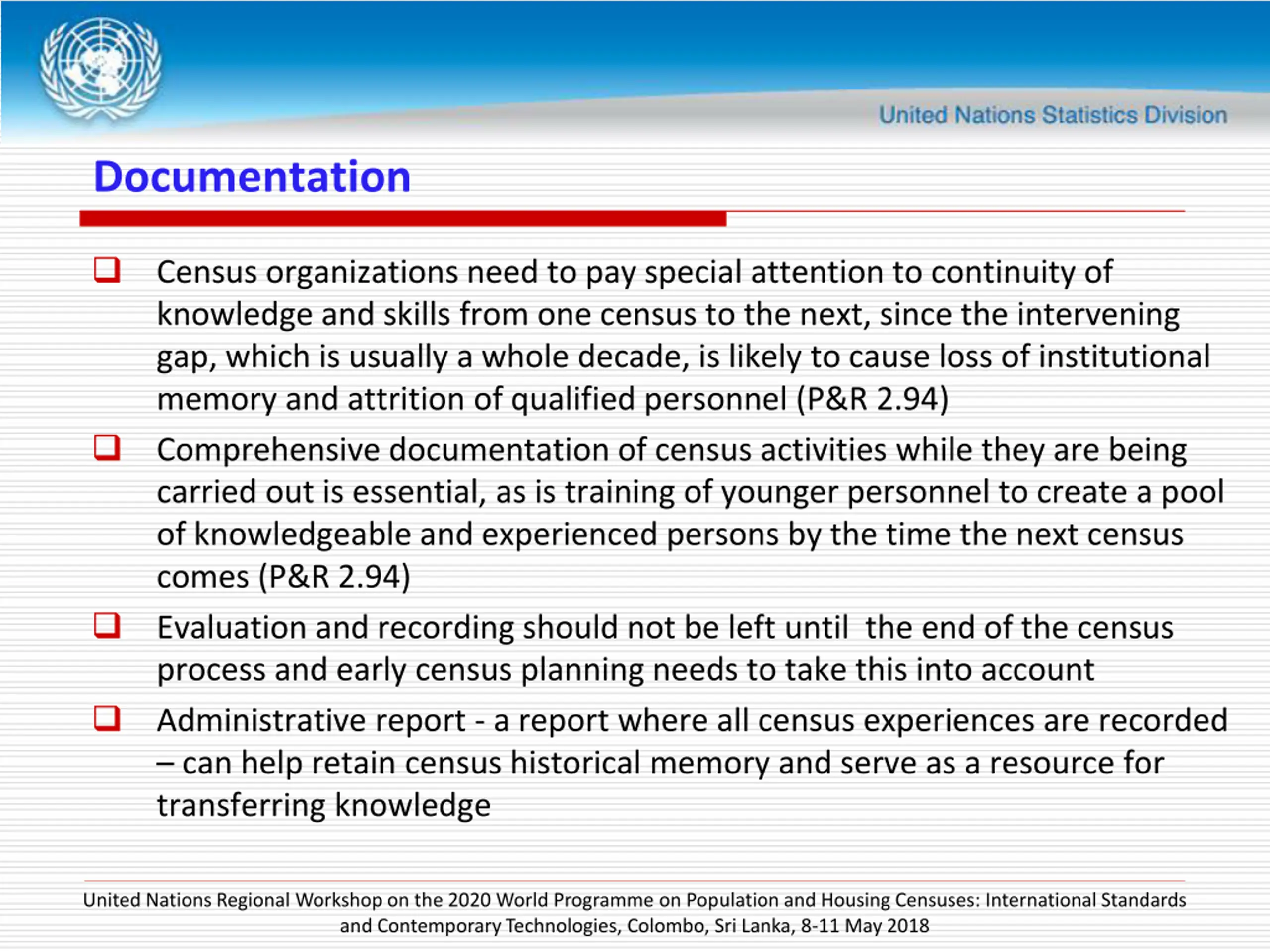 Documentation Census organizations need to pay special attention to continuity of knowledge and skills from one census to the next, since the intervening gap, which is usually a whole decade, is likely to cause loss of institutional memory and attrition of qualified personnel (P&R 2.94) Comprehensive documentation of census activities while they are being carried out is essential, as is training of younger personnel to create a pool of knowledgeable and experienced persons by the time the next census comes (P&R 2.94) Evaluation and recording should not be left until the end of the census process and early census planning needs to take this into account Administrative report - a report where all census experiences are recorded can help retain census historical memory and serve as a resource for transferring knowledge United Nations Regional Workshop on the 2020 World Programme on Population and Housing Censuses: International Standards and Contemporary Technologies, Colombo, Sri Lanka, 8-11 May 2018