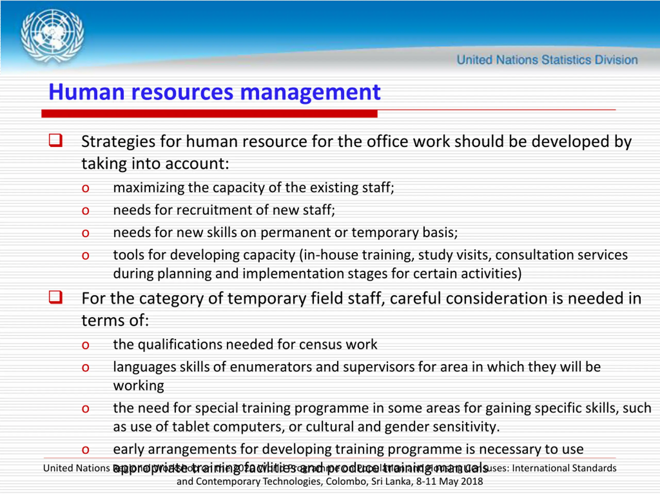 Human resources management Strategies for human resource for the office work should be developed by taking into account: o maximizing the capacity of the existing staff; o needs for recruitment of new staff; o needs for new skills on permanent or temporary basis; o tools for developing capacity (in house training, study visits, consultation services during planning and implementation stages for certain activities) For the category of temporary field staff, careful consideration is needed in terms of: o the qualifications needed for census work o languages skills of enumerators and supervisors for area in which they will be working o the need for special training programme in some areas for gaining specific skills, such as use of tablet computers, or cultural and gender sensitivity. o early arrangements for developing training programme is necessary to use appropriate training facilities and produce training manuals United Nations Regional Workshop on the 2020 World Programme on Population and Housing Censuses: International Standards and Contemporary Technologies, Colombo, Sri Lanka, 8-11 May 2018