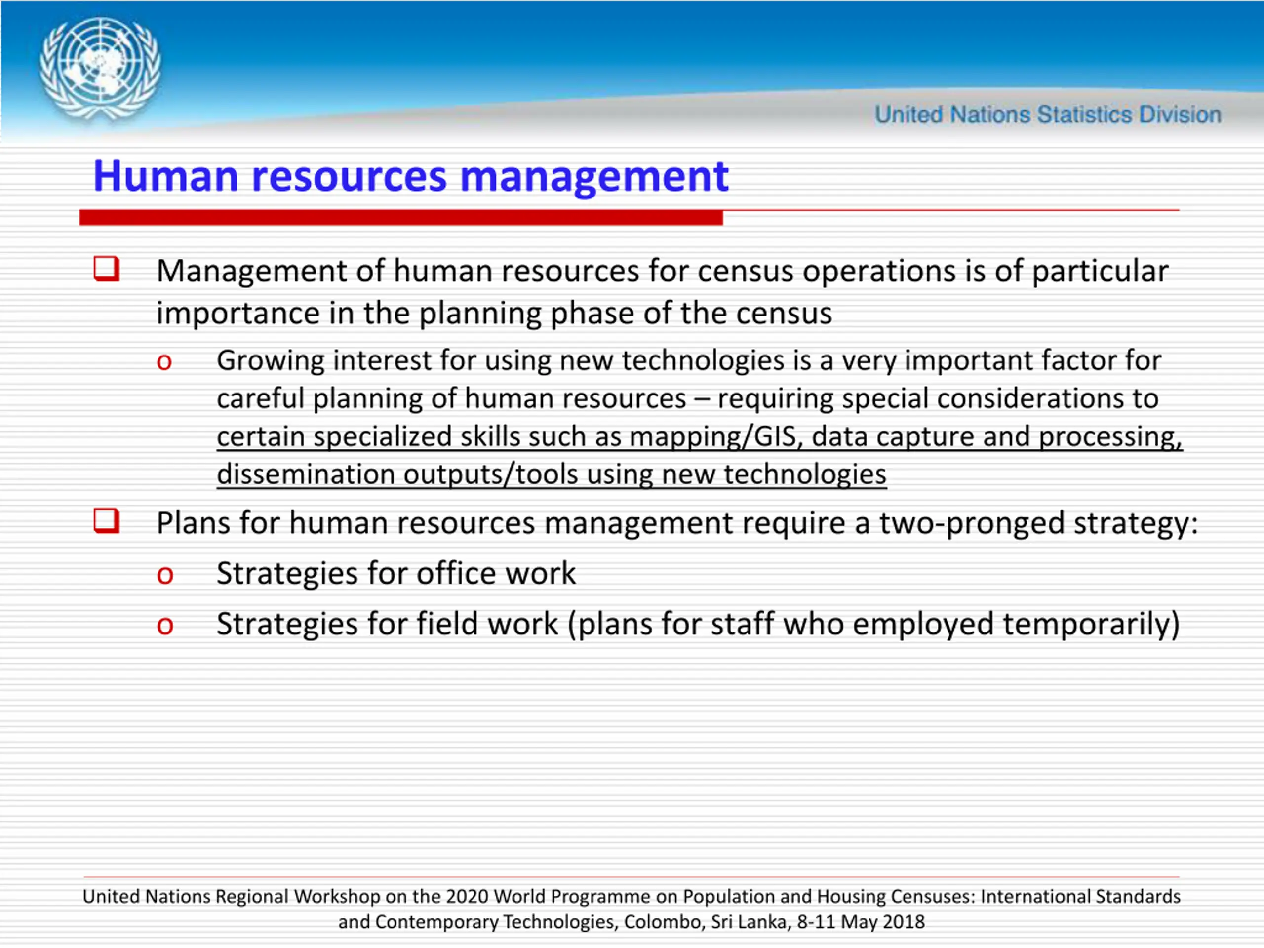 Human resources management Management of human resources for census operations is of particular importance in the planning phase of the census o Growing interest for using new technologies is a very important factor for careful planning of human resources requiring special considerations to certain specialized skills such as mapping/GIS, data capture and processing, dissemination outputs/tools using new technologies Plans for human resources management require a two-pronged strategy: o Strategies for office work o Strategies for field work (plans for staff who employed temporarily) United Nations Regional Workshop on the 2020 World Programme on Population and Housing Censuses: International Standards and Contemporary Technologies, Colombo, Sri Lanka, 8-11 May 2018