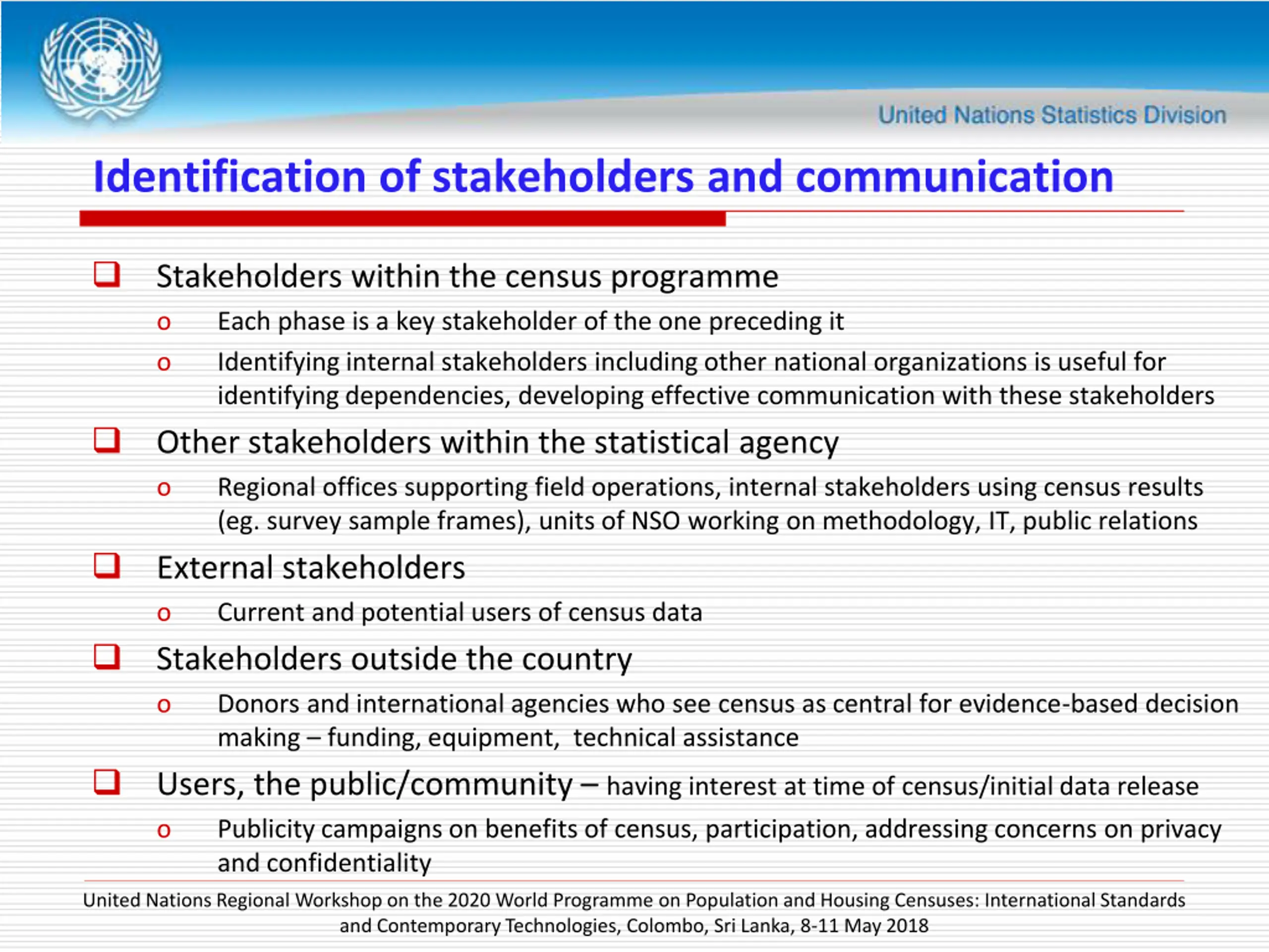 Identification of stakeholders and communication Stakeholders within the census programme o Each phase is a key stakeholder of the one preceding it o Identifying internal stakeholders including other national organizations is useful for identifying dependencies, developing effective communication with these stakeholders Other stakeholders within the statistical agency o Regional offices supporting field operations, internal stakeholders using census results (eg. survey sample frames), units of NSO working on methodology, IT, public relations External stakeholders o Current and potential users of census data Stakeholders outside the country o Donors and international agencies who see census as central for evidence-based decision making funding, equipment, technical assistance Users, the public/community having interest at time of census/initial data release o Publicity campaigns on benefits of census, participation, addressing concerns on privacy and confidentiality United Nations Regional Workshop on the 2020 World Programme on Population and Housing Censuses: International Standards and Contemporary Technologies, Colombo, Sri Lanka, 8-11 May 2018