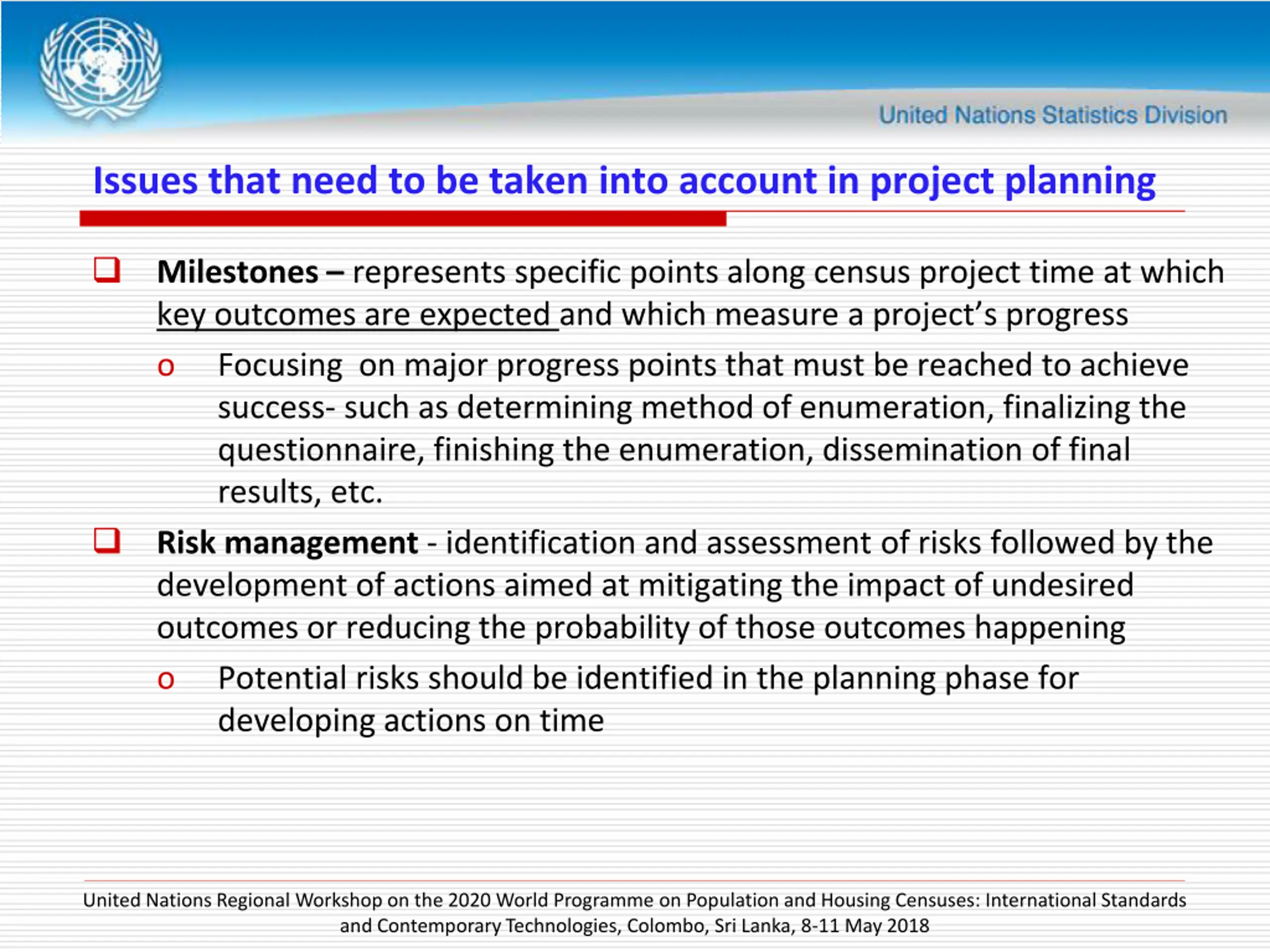 Issues that need to be taken into account in project planning Milestones represents specific points along census project time at which key outcomes are expected and which measure a project s progress o Focusing on major progress points that must be reached to achieve success- such as determining method of enumeration, finalizing the questionnaire, finishing the enumeration, dissemination of final results, etc. Risk management - identification and assessment of risks followed by the development of actions aimed at mitigating the impact of undesired outcomes or reducing the probability of those outcomes happening o Potential risks should be identified in the planning phase for developing actions on time United Nations Regional Workshop on the 2020 World Programme on Population and Housing Censuses: International Standards and Contemporary Technologies, Colombo, Sri Lanka, 8-11 May 2018