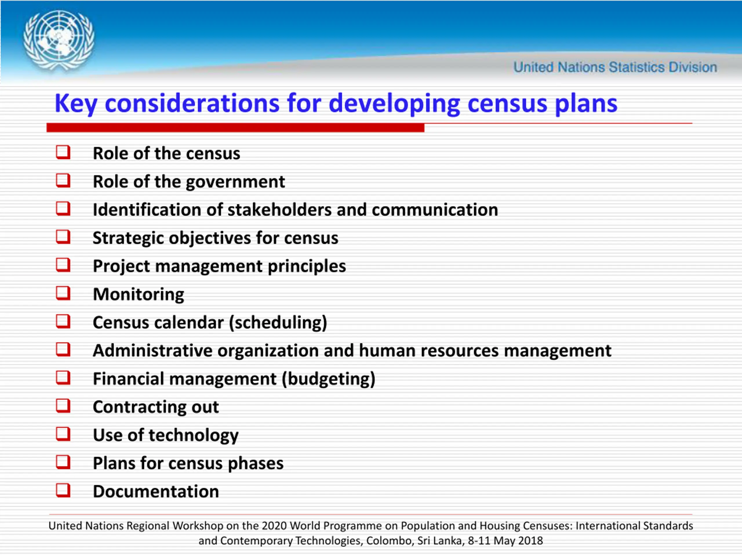 Key considerations for developing census plans Role of the census Role of the government Identification of stakeholders and communication Strategic objectives for census Project management principles Monitoring Census calendar (scheduling) Administrative organization and human resources management Financial management (budgeting) Contracting out Use of technology Plans for census phases Documentation United Nations Regional Workshop on the 2020 World Programme on Population and Housing Censuses: International Standards and Contemporary Technologies, Colombo, Sri Lanka, 8-11 May 2018