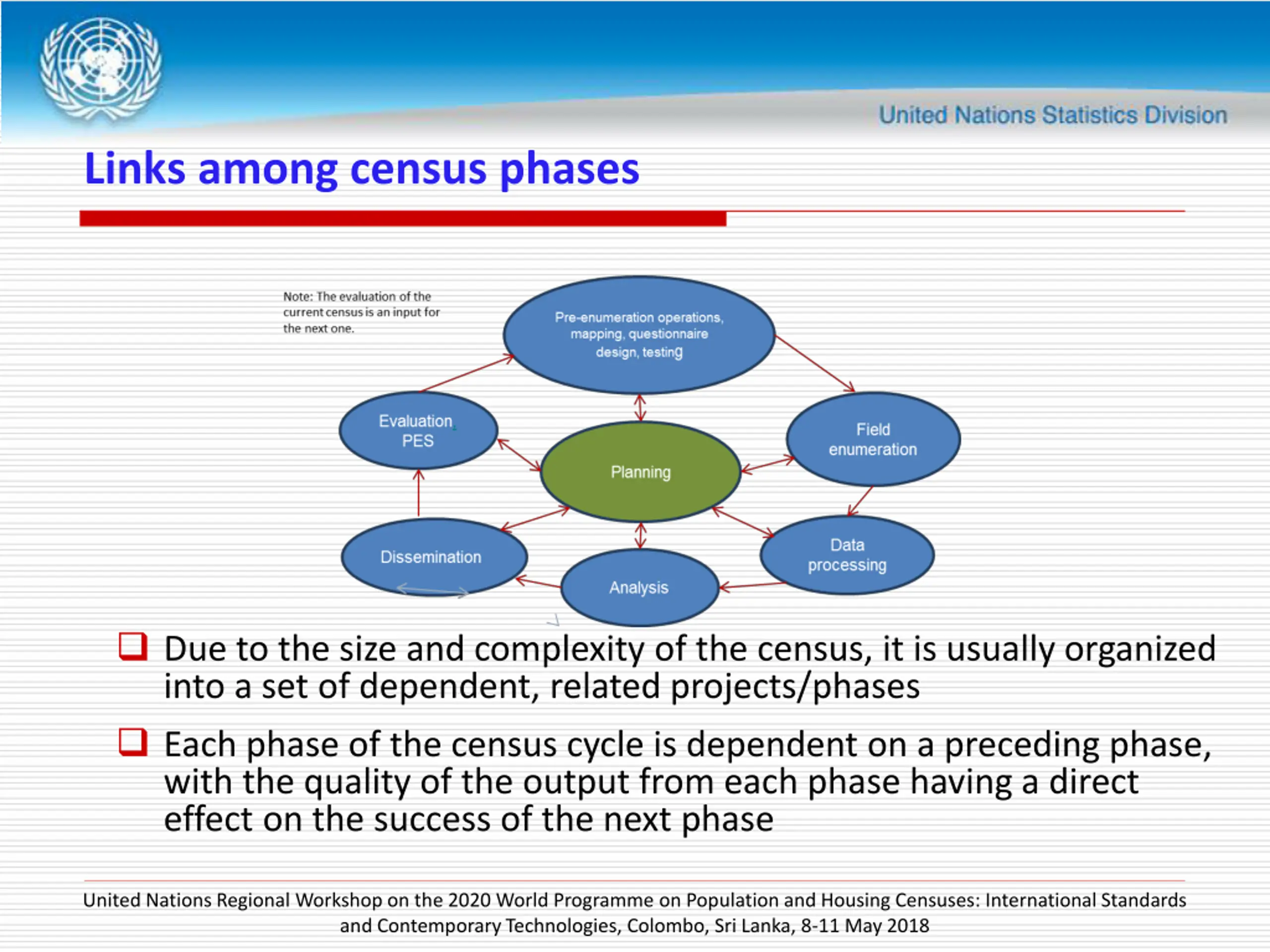 Links among census phases Due to the size and complexity of the census, it is usually organized into a set of dependent, related projects/phases Each phase of the census cycle is dependent on a preceding phase, with the quality of the output from each phase having a direct effect on the success of the next phase United Nations Regional Workshop on the 2020 World Programme on Population and Housing Censuses: International Standards and Contemporary Technologies, Colombo, Sri Lanka, 8-11 May 2018