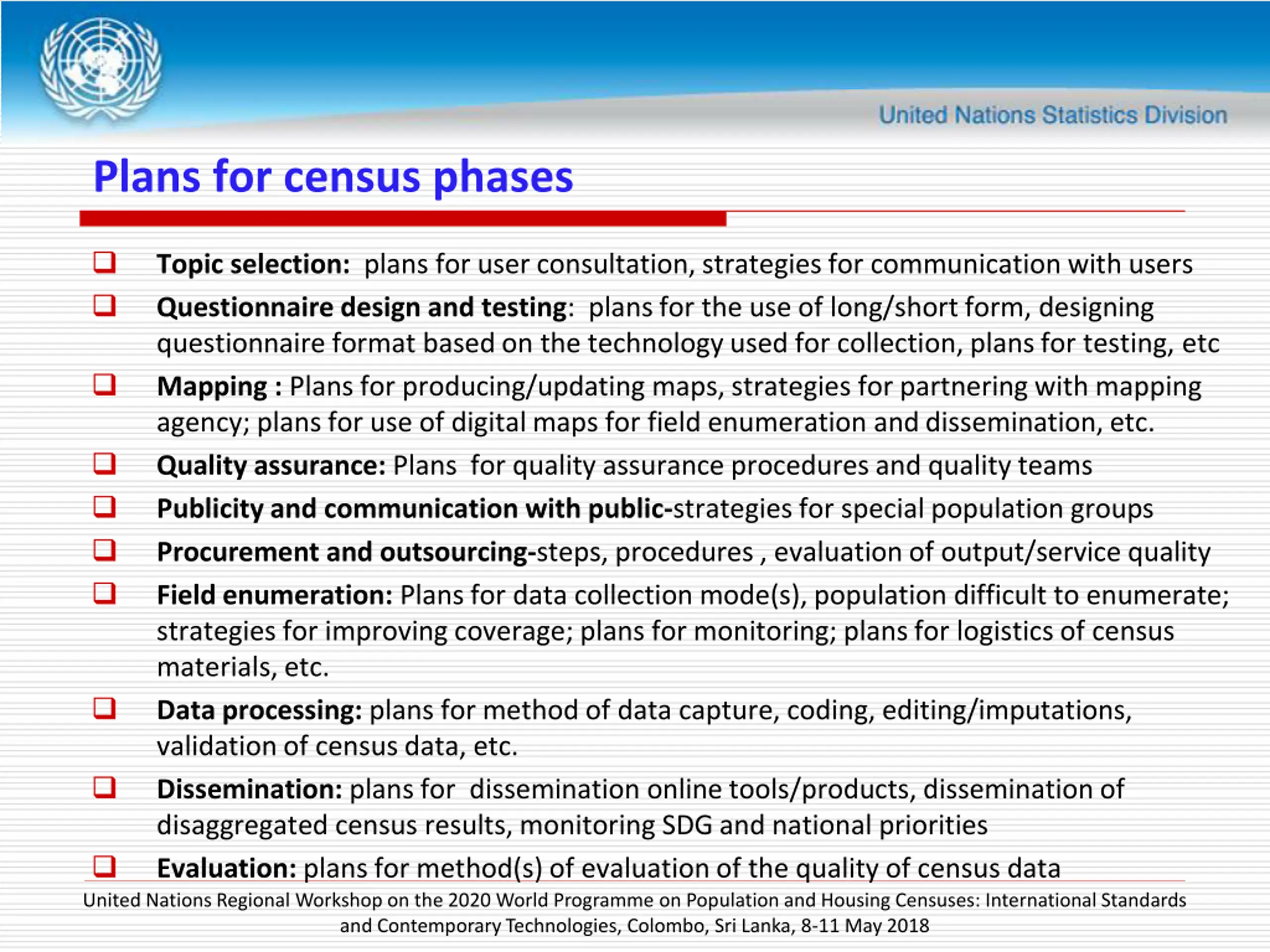 Plans for census phases Topic selection: plans for user consultation, strategies for communication with users Questionnaire design and testing: plans for the use of long/short form, designing questionnaire format based on the technology used for collection, plans for testing, etc Mapping : Plans for producing/updating maps, strategies for partnering with mapping agency; plans for use of digital maps for field enumeration and dissemination, etc. Quality assurance: Plans for quality assurance procedures and quality teams Publicity and communication with public-strategies for special population groups Procurement and outsourcing-steps, procedures , evaluation of output/service quality Field enumeration: Plans for data collection mode(s), population difficult to enumerate; strategies for improving coverage; plans for monitoring; plans for logistics of census materials, etc. Data processing: plans for method of data capture, coding, editing/imputations, validation of census data, etc. Dissemination: plans for dissemination online tools/products, dissemination of disaggregated census results, monitoring SDG and national priorities Evaluation: plans for method(s) of evaluation of the quality of census data United Nations Regional Workshop on the 2020 World Programme on Population and Housing Censuses: International Standards and Contemporary Technologies, Colombo, Sri Lanka, 8-11 May 2018