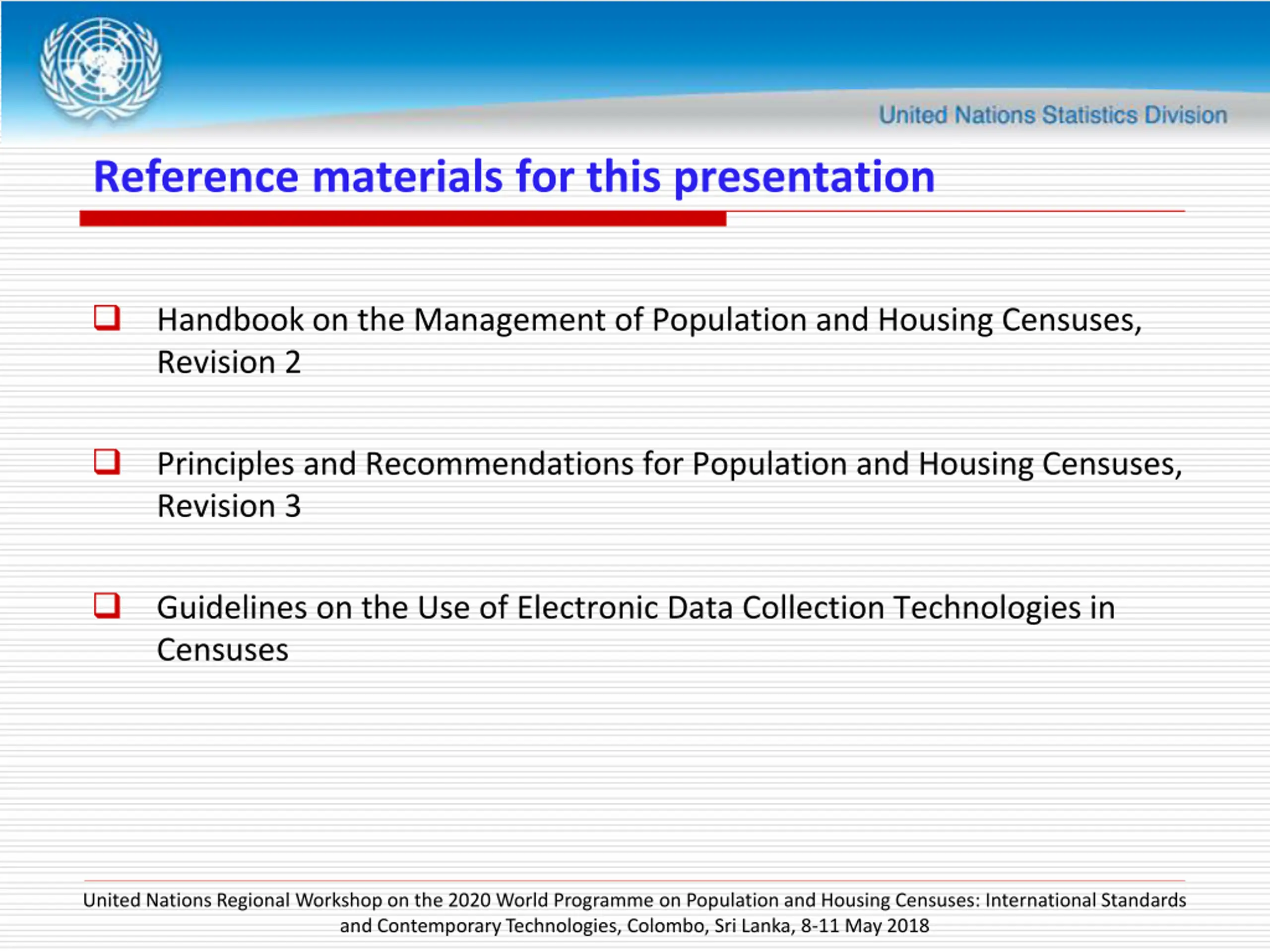 Reference materials for this presentation Handbook on the Management of Population and Housing Censuses, Revision 2 Principles and Recommendations for Population and Housing Censuses, Revision 3 Guidelines on the Use of Electronic Data Collection Technologies in Censuses United Nations Regional Workshop on the 2020 World Programme on Population and Housing Censuses: International Standards and Contemporary Technologies, Colombo, Sri Lanka, 8-11 May 2018