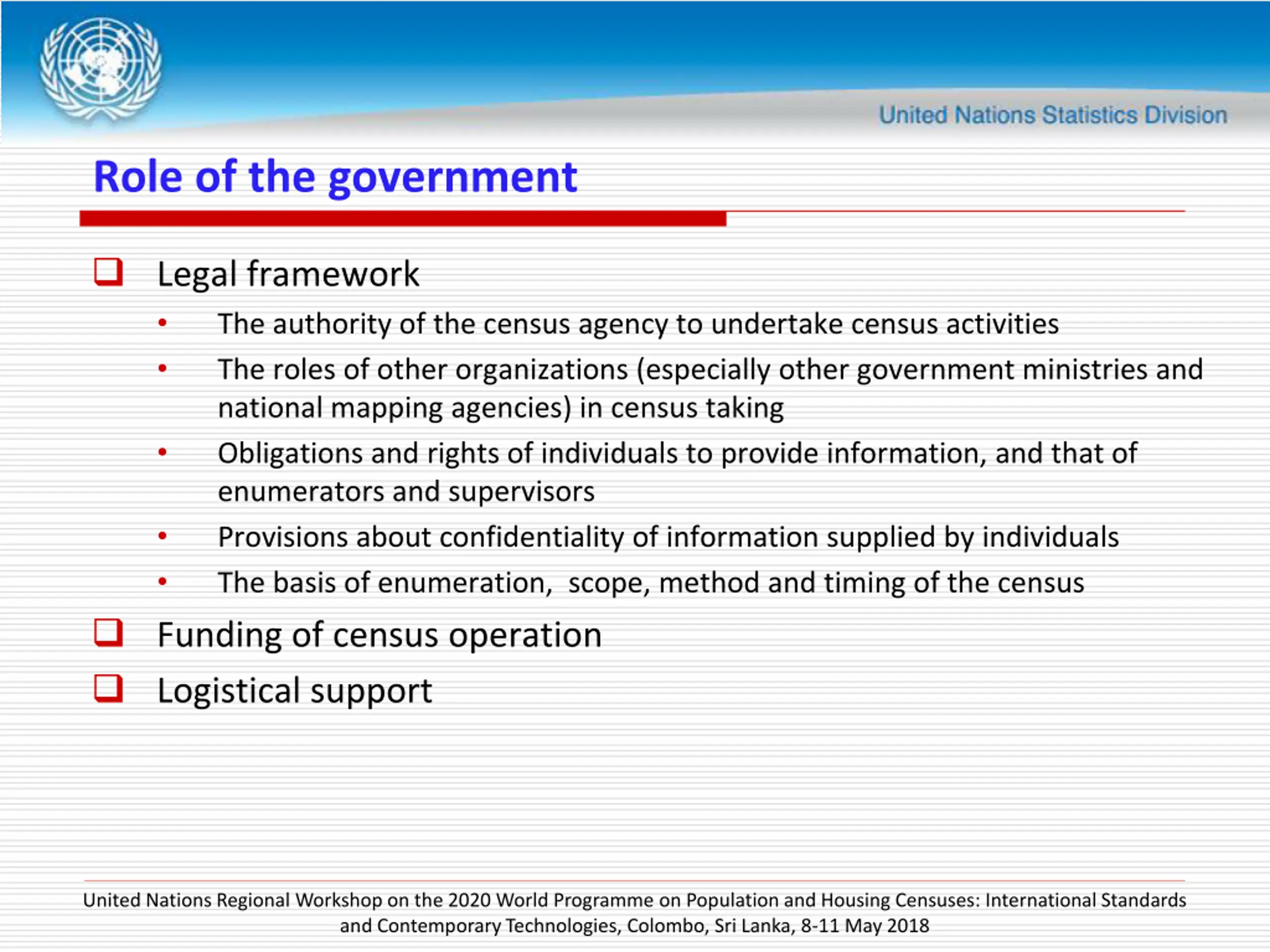 Role of the government Legal framework The authority of the census agency to undertake census activities The roles of other organizations (especially other government ministries and national mapping agencies) in census taking Obligations and rights of individuals to provide information, and that of enumerators and supervisors Provisions about confidentiality of information supplied by individuals The basis of enumeration, scope, method and timing of the census Funding of census operation Logistical support United Nations Regional Workshop on the 2020 World Programme on Population and Housing Censuses: International Standards and Contemporary Technologies, Colombo, Sri Lanka, 8-11 May 2018