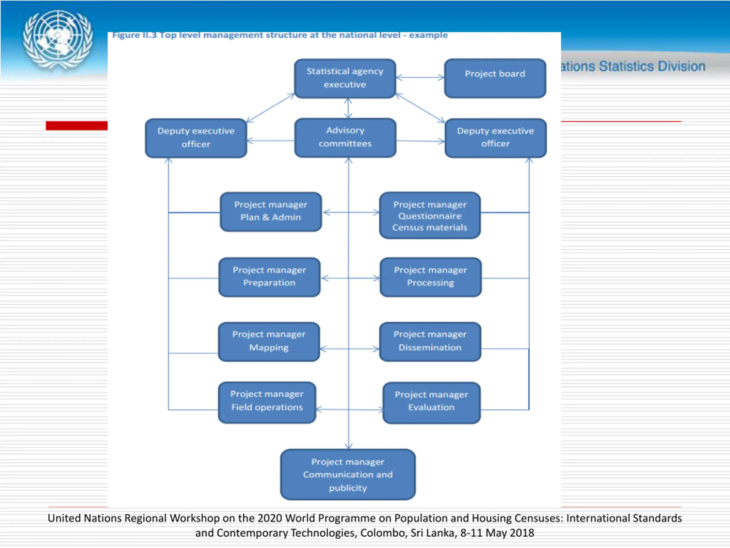 Administrative organization and human resources management Establishing the administrative organization and staffing of a census operation is a big challenge due to the size and complexity of the project, geographic spread, long project timeline, coordination with a wide range of organizations, and the number of workers involved o census plans need to articulate the roles and responsibilities of the hierarchy of census staff The development phases (planning and preparations) and the operational phases might require different management approaches because the nature of the workforces and the tasks performed are quite different United Nations Regional Workshop on the 2020 World Programme on Population and Housing Censuses: International Standards and Contemporary Technologies, Colombo, Sri Lanka, 8-11 May 2018