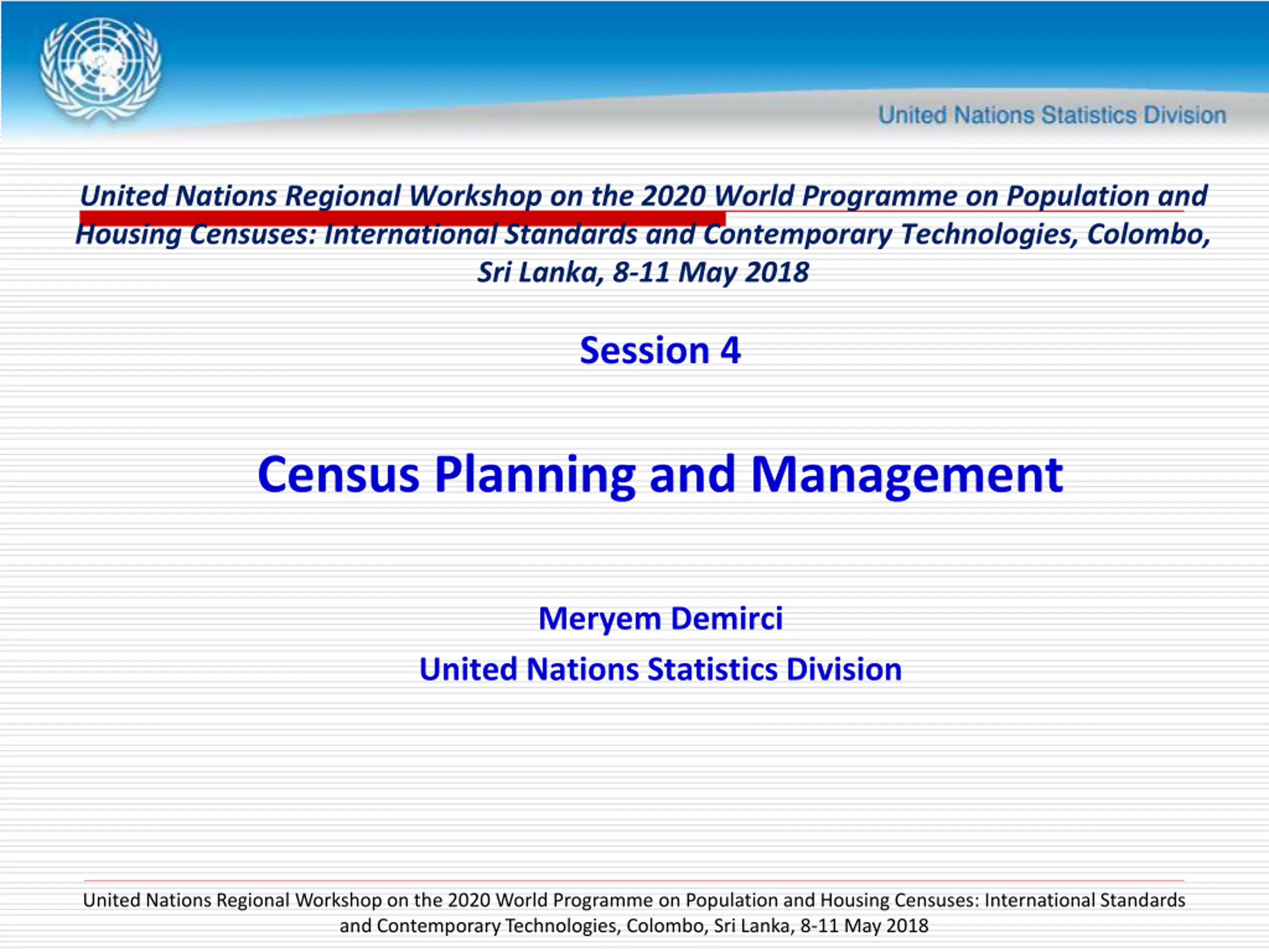 United Nations Regional Workshop on the 2020 World Programme on Population and Housing Censuses: International Standards and Contemporary Technologies, Colombo, Sri Lanka, 8-11 May 2018 Session 4 Census Planning and Management Meryem Demirci United Nations Statistics Division United Nations Regional Workshop on the 2020 World Programme on Population and Housing Censuses: International Standards and Contemporary Technologies, Colombo, Sri Lanka, 8-11 May 2018