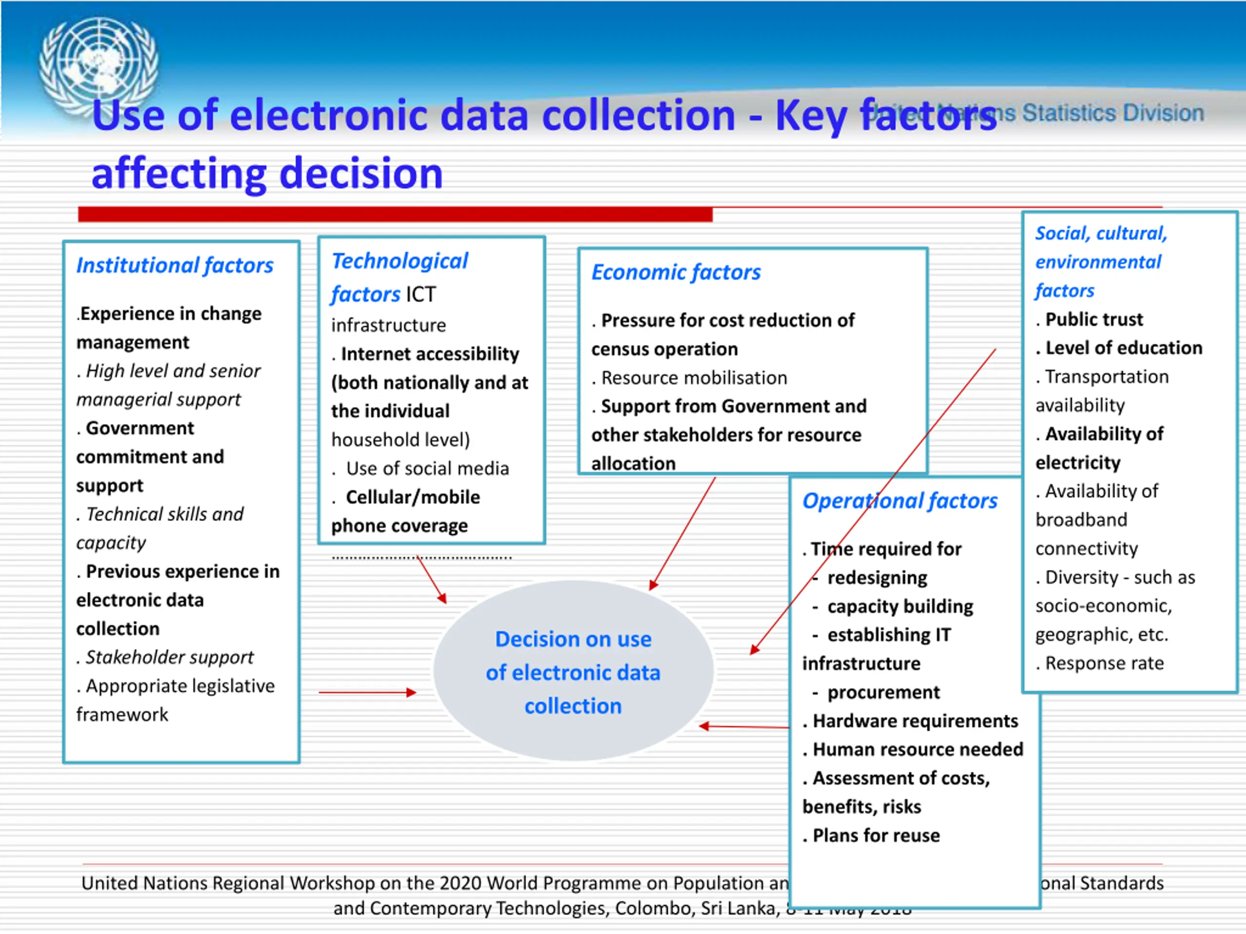 Use of electronic data collection - Key factors affecting decision Social, cultural, environmental factors . Public trust . Level of education . Transportation availability . Availability of electricity . Availability of broadband connectivity . Diversity - such as socio-economic, geographic, etc. . Response rate Technological factors ICT infrastructure . Internet accessibility (both nationally and at the individual household level) . Use of social media . Cellular/mobile phone coverage .. Institutional factors Economic factors .Experience in change management . High level and senior managerial support . Government commitment and support . Technical skills and capacity . Previous experience in electronic data collection . Stakeholder support . Appropriate legislative framework . Pressure for cost reduction of census operation . Resource mobilisation . Support from Government and other stakeholders for resource allocation Operational factors . Time required for - redesigning - capacity building - establishing IT infrastructure - procurement . Hardware requirements . Human resource needed . Assessment of costs, benefits, risks . Plans for reuse Decision on use of electronic data collection United Nations Regional Workshop on the 2020 World Programme on Population and Housing Censuses: International Standards and Contemporary Technologies, Colombo, Sri Lanka, 8-11 May 2018