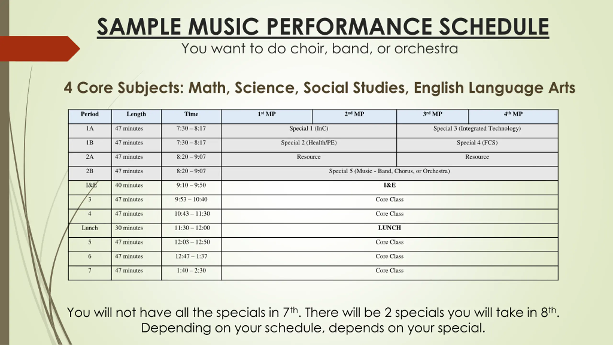 SAMPLE MUSIC PERFORMANCE SCHEDULE You want to do choir, band, or orchestra 4 Core Subjects: Math, Science, Social Studies, English Language Arts Period Length Time 1st MP 2nd MP 3rd MP 4th MP 1A 47 minutes 7:30 8:17 Special 1 (InC) Special 3 (Integrated Technology) 1B 47 minutes 7:30 8:17 Special 2 (Health/PE) Special 4 (FCS) 2A 47 minutes 8:20 9:07 Resource Resource 2B 47 minutes 8:20 9:07 Special 5 (Music - Band, Chorus, or Orchestra) I&E I&E 40 minutes 9:10 9:50 3 47 minutes 9:53 10:40 Core Class 4 47 minutes 10:43 11:30 Core Class LUNCH Lunch 30 minutes 11:30 12:00 5 47 minutes 12:03 12:50 Core Class 6 47 minutes 12:47 1:37 Core Class 7 47 minutes 1:40 2:30 Core Class You will not have all the specials in 7th. There will be 2 specials you will take in 8th. Depending on your schedule, depends on your special.