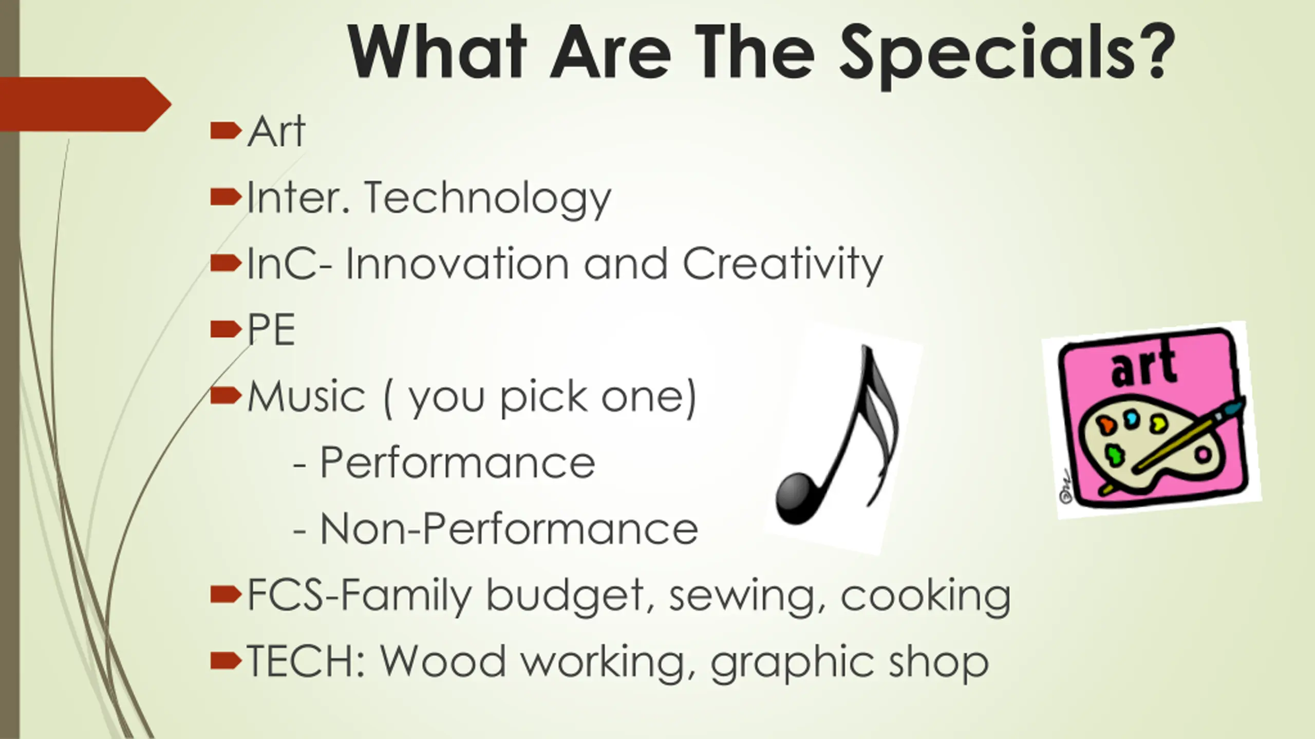What Are The Specials? Art Inter. Technology InC- Innovation and Creativity PE Music ( you pick one) - Performance - Non-Performance FCS-Family budget, sewing, cooking TECH: Wood working, graphic shop