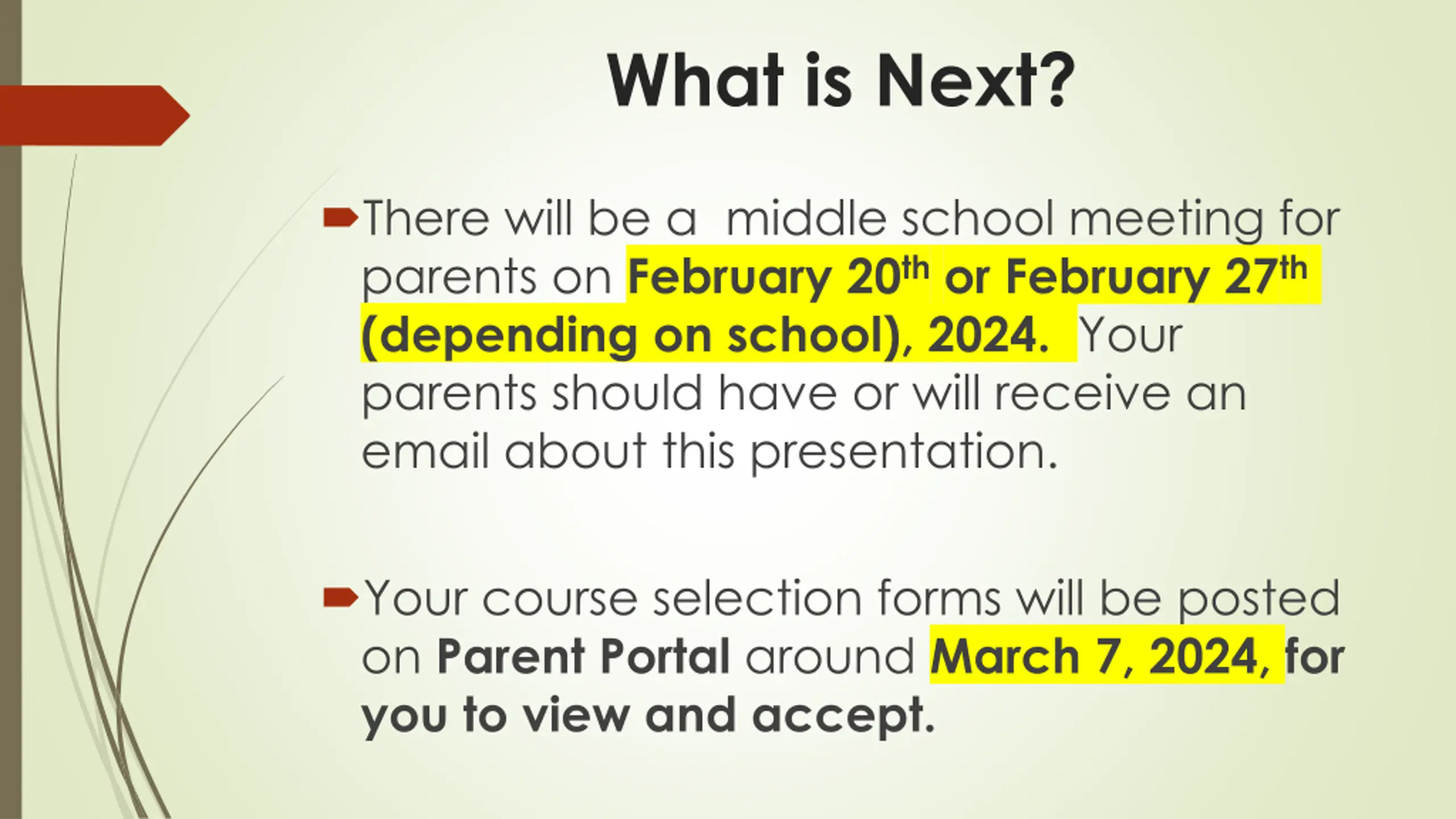 What is Next? There will be a middle school meeting for parents on February 20thor February 27th (depending on school), 2024. Your parents should have or will receive an email about this presentation. Your course selection forms will be posted on Parent Portal around March 7, 2024, for you to view and accept.