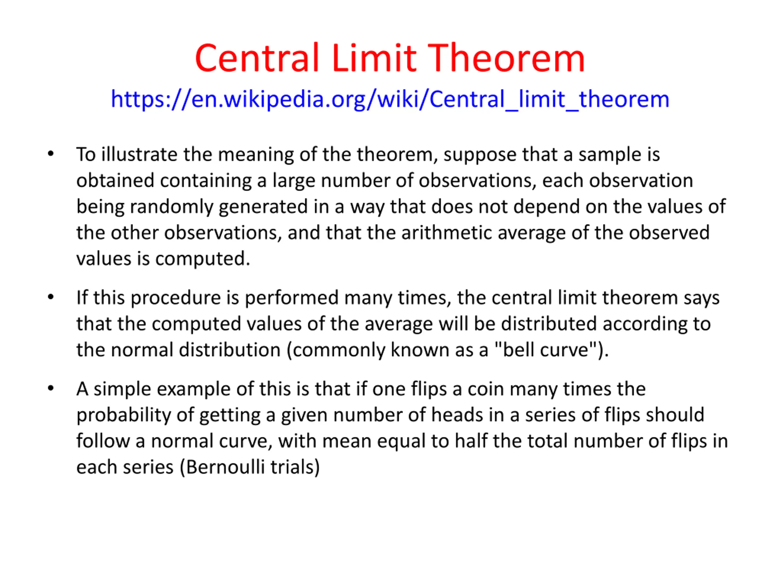 Central Limit Theorem https://en.wikipedia.org/wiki/Central_limit_theorem To illustrate the meaning of the theorem, suppose that a sample is obtained containing a large number of observations, each observation being randomly generated in a way that does not depend on the values of the other observations, and that the arithmetic average of the observed values is computed. If this procedure is performed many times, the central limit theorem says that the computed values of the average will be distributed according to the normal distribution (commonly known as a "bell curve"). A simple example of this is that if one flips a coin many times the probability of getting a given number of heads in a series of flips should follow a normal curve, with mean equal to half the total number of flips in each series (Bernoulli trials)