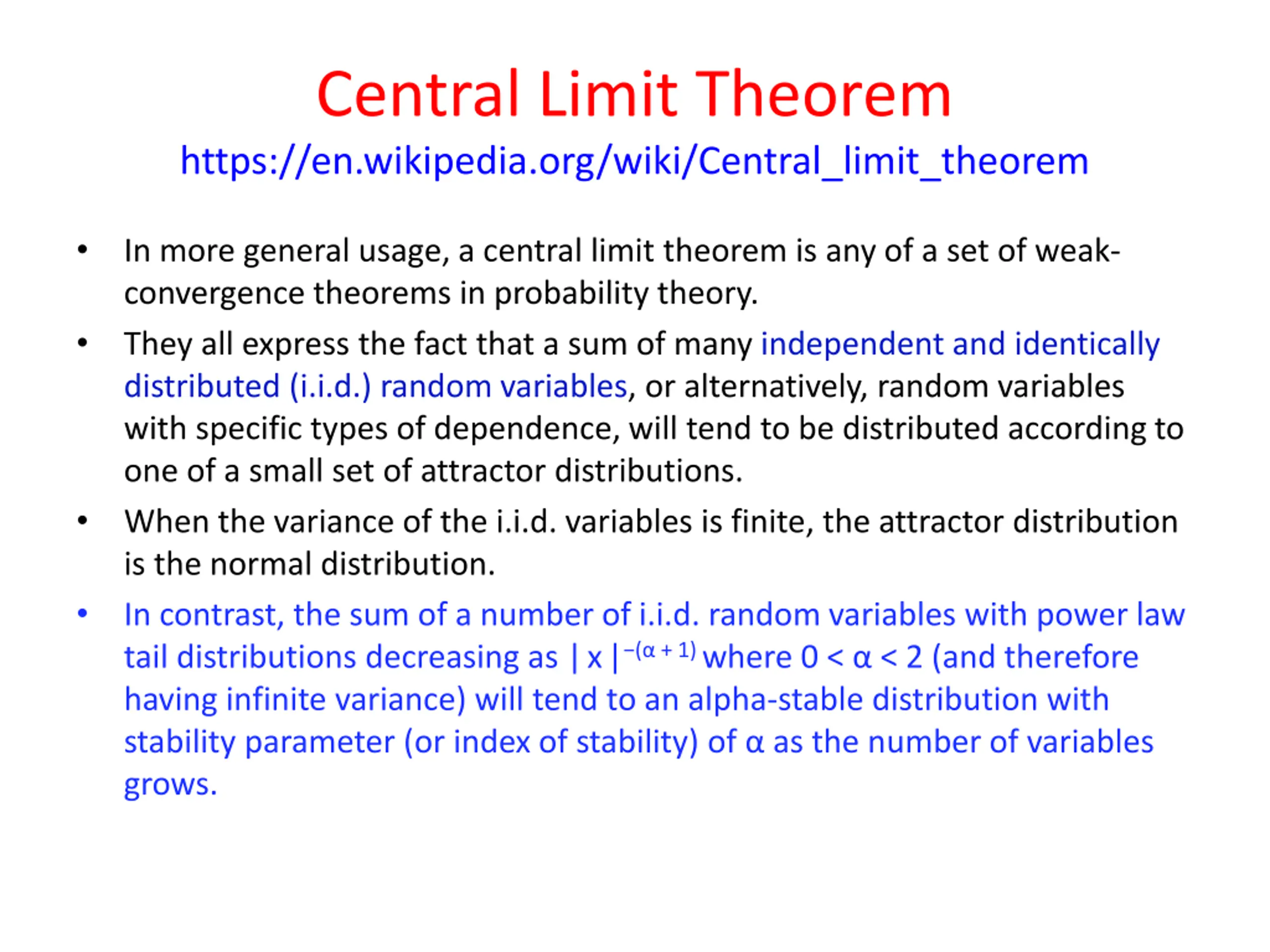 Central Limit Theorem https://en.wikipedia.org/wiki/Central_limit_theorem In more general usage, a central limit theorem is any of a set of weak- convergence theorems in probability theory. They all express the fact that a sum of many independent and identically distributed (i.i.d.) random variables, or alternatively, random variables with specific types of dependence, will tend to be distributed according to one of a small set of attractor distributions. When the variance of the i.i.d. variables is finite, the attractor distribution is the normal distribution. In contrast, the sum of a number of i.i.d. random variables with power law tail distributions decreasing as | x | ( + 1)where 0 < < 2 (and therefore having infinite variance) will tend to an alpha-stable distribution with stability parameter (or index of stability) of as the number of variables grows.