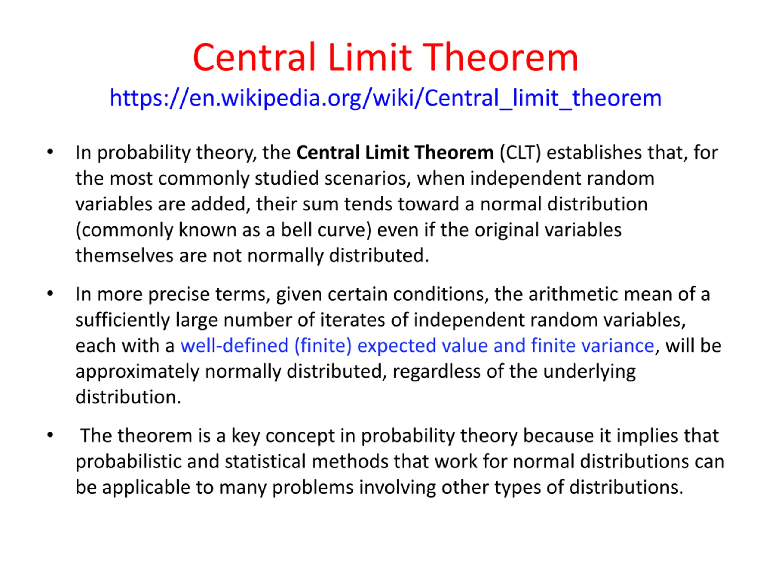 Central Limit Theorem https://en.wikipedia.org/wiki/Central_limit_theorem In probability theory, the Central Limit Theorem (CLT) establishes that, for the most commonly studied scenarios, when independent random variables are added, their sum tends toward a normal distribution (commonly known as a bell curve) even if the original variables themselves are not normally distributed. In more precise terms, given certain conditions, the arithmetic mean of a sufficiently large number of iterates of independent random variables, each with a well-defined (finite) expected value and finite variance, will be approximately normally distributed, regardless of the underlying distribution. The theorem is a key concept in probability theory because it implies that probabilistic and statistical methods that work for normal distributions can be applicable to many problems involving other types of distributions.