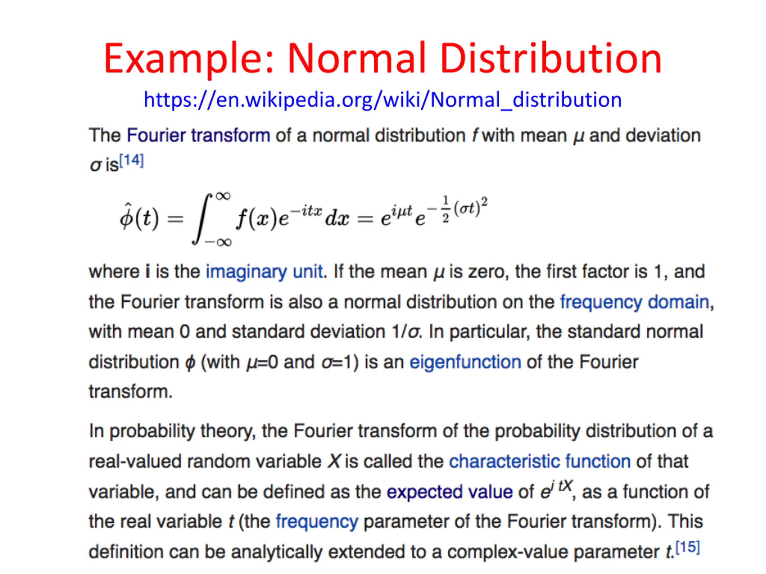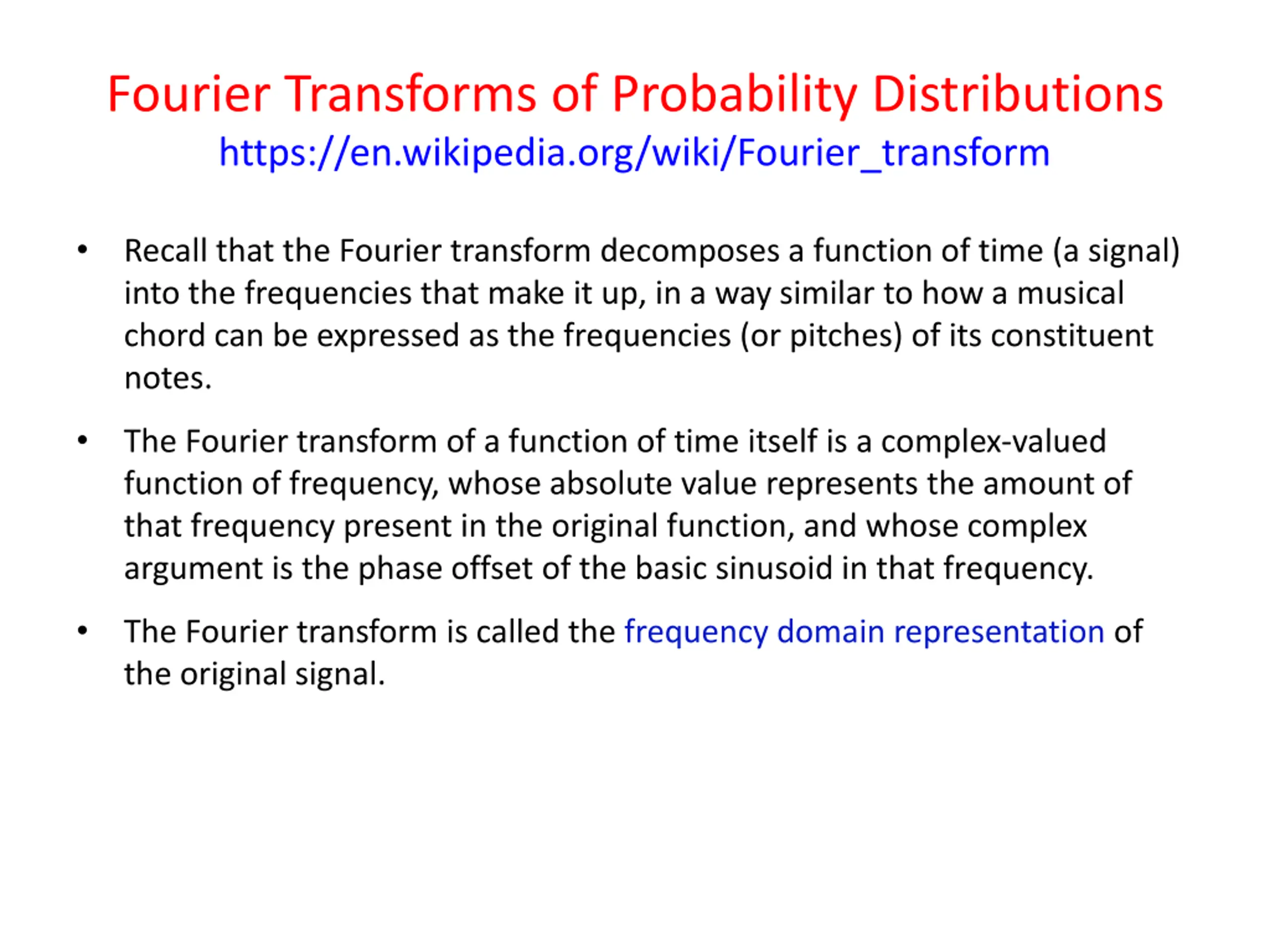 Fourier Transforms of Probability Distributions https://en.wikipedia.org/wiki/Fourier_transform Recall that the Fourier transform decomposes a function of time (a signal) into the frequencies that make it up, in a way similar to how a musical chord can be expressed as the frequencies (or pitches) of its constituent notes. The Fourier transform of a function of time itself is a complex-valued function of frequency, whose absolute value represents the amount of that frequency present in the original function, and whose complex argument is the phase offset of the basic sinusoid in that frequency. The Fourier transform is called the frequency domain representation of the original signal.