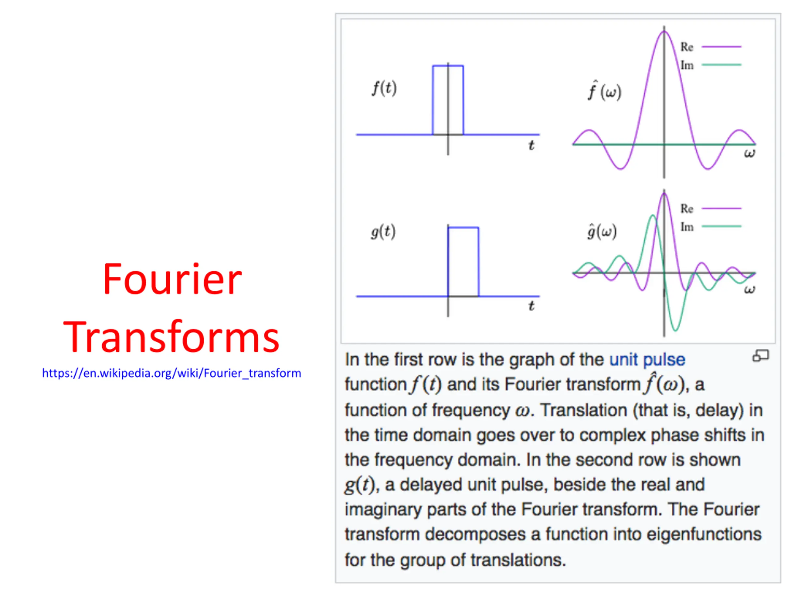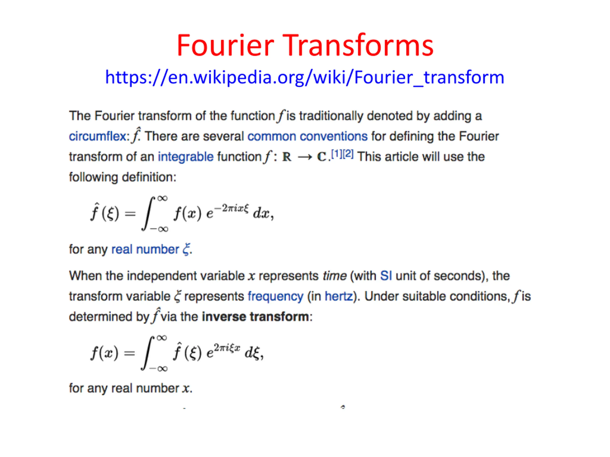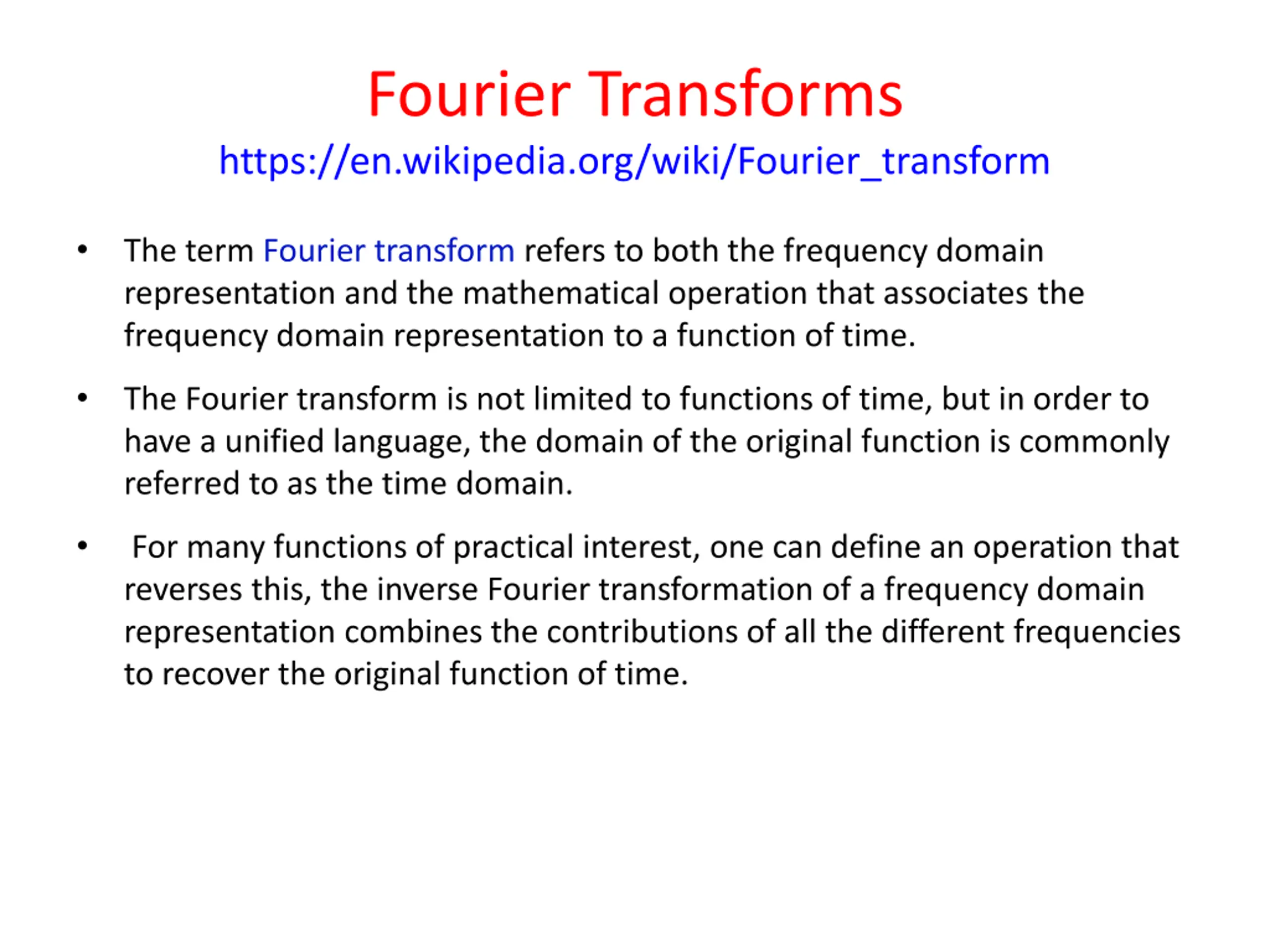 Fourier Transforms https://en.wikipedia.org/wiki/Fourier_transform The term Fourier transform refers to both the frequency domain representation and the mathematical operation that associates the frequency domain representation to a function of time. The Fourier transform is not limited to functions of time, but in order to have a unified language, the domain of the original function is commonly referred to as the time domain. For many functions of practical interest, one can define an operation that reverses this, the inverse Fourier transformation of a frequency domain representation combines the contributions of all the different frequencies to recover the original function of time.