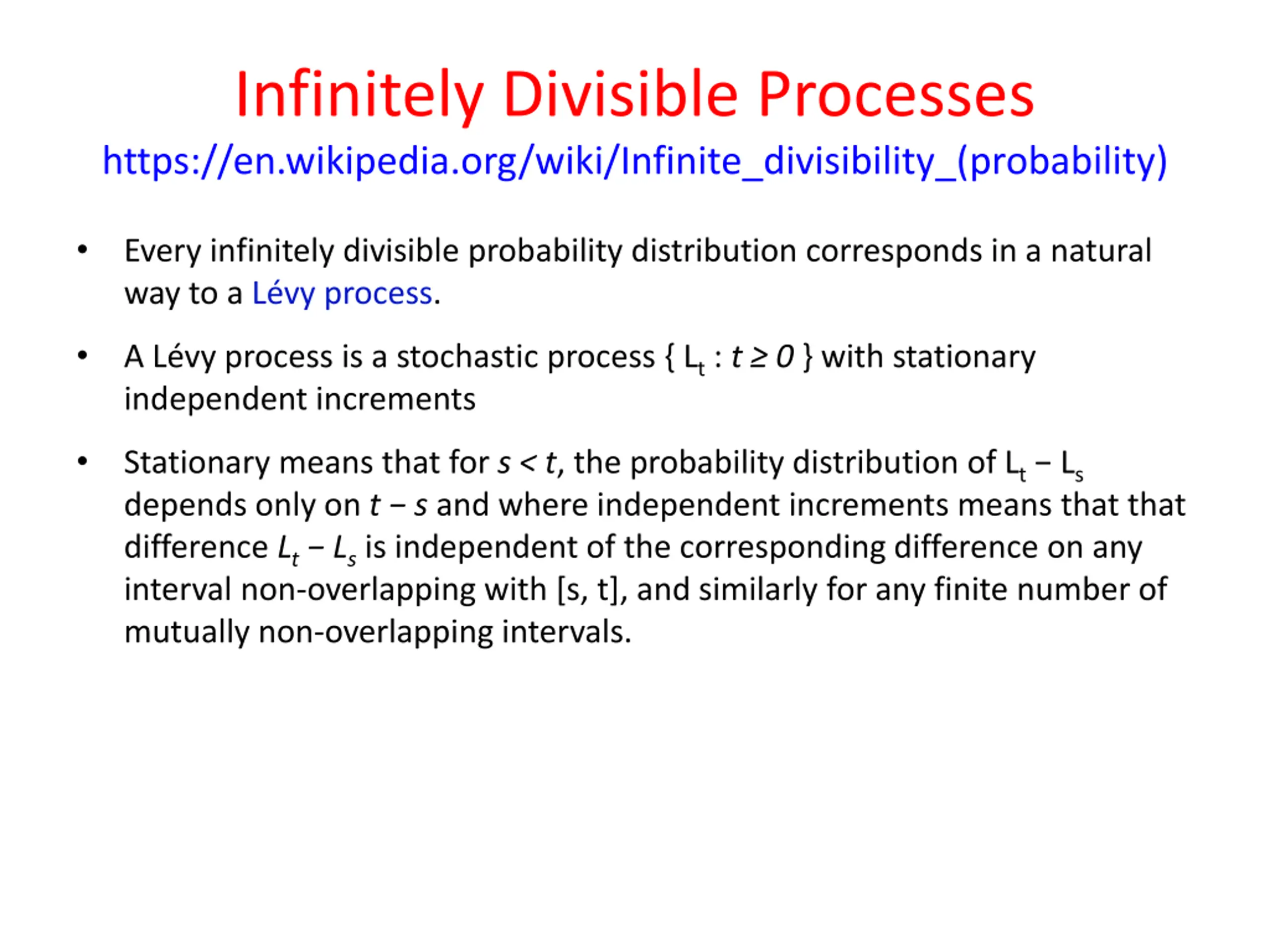 Infinitely Divisible Processes https://en.wikipedia.org/wiki/Infinite_divisibility_(probability) Every infinitely divisible probability distribution corresponds in a natural way to a L vy process. A L vy process is a stochastic process { Lt: t 0 } with stationary independent increments Stationary means that for s < t, the probability distribution of Lt Ls depends only on t s and where independent increments means that that difference Lt Lsis independent of the corresponding difference on any interval non-overlapping with [s, t], and similarly for any finite number of mutually non-overlapping intervals.