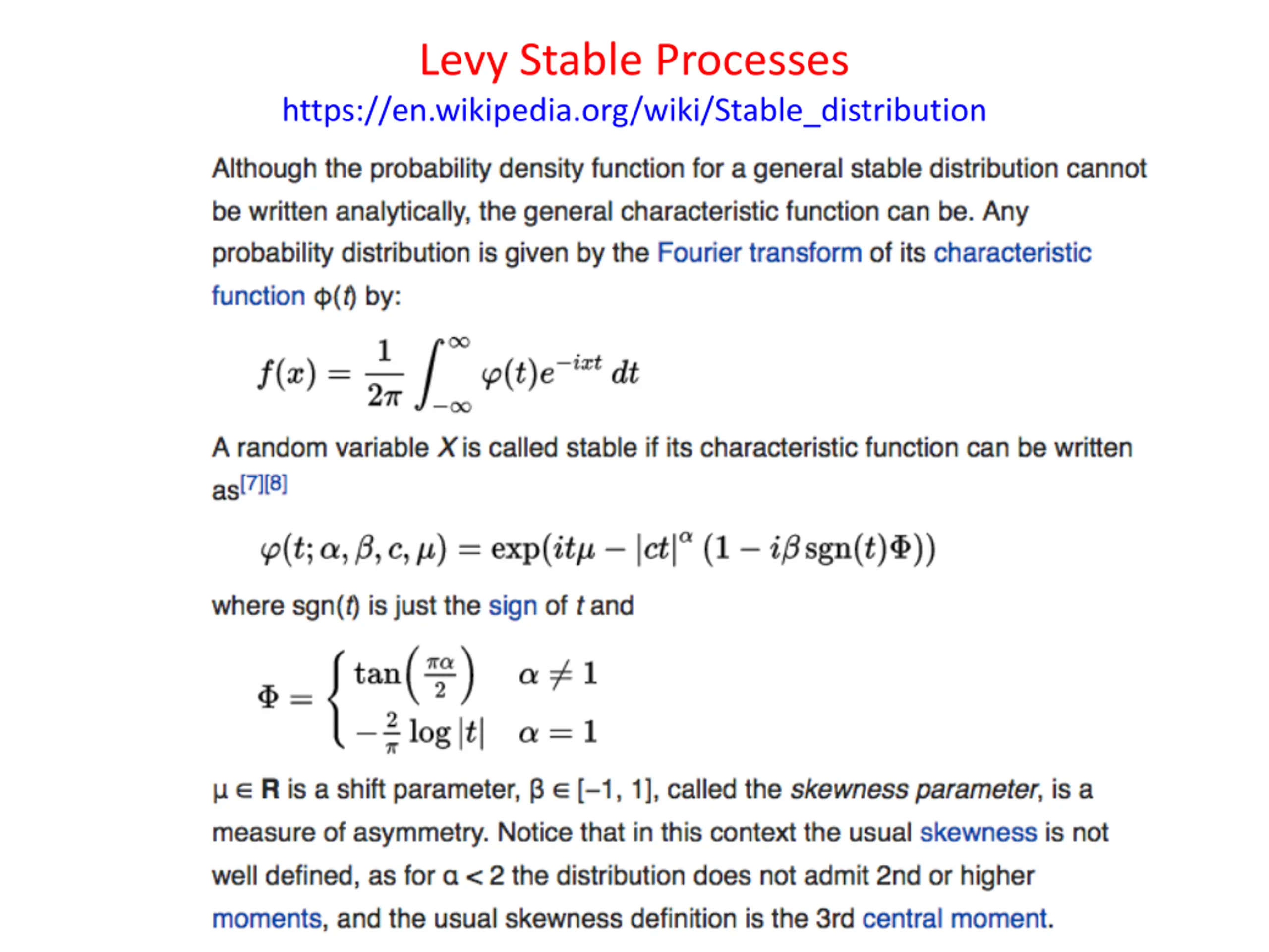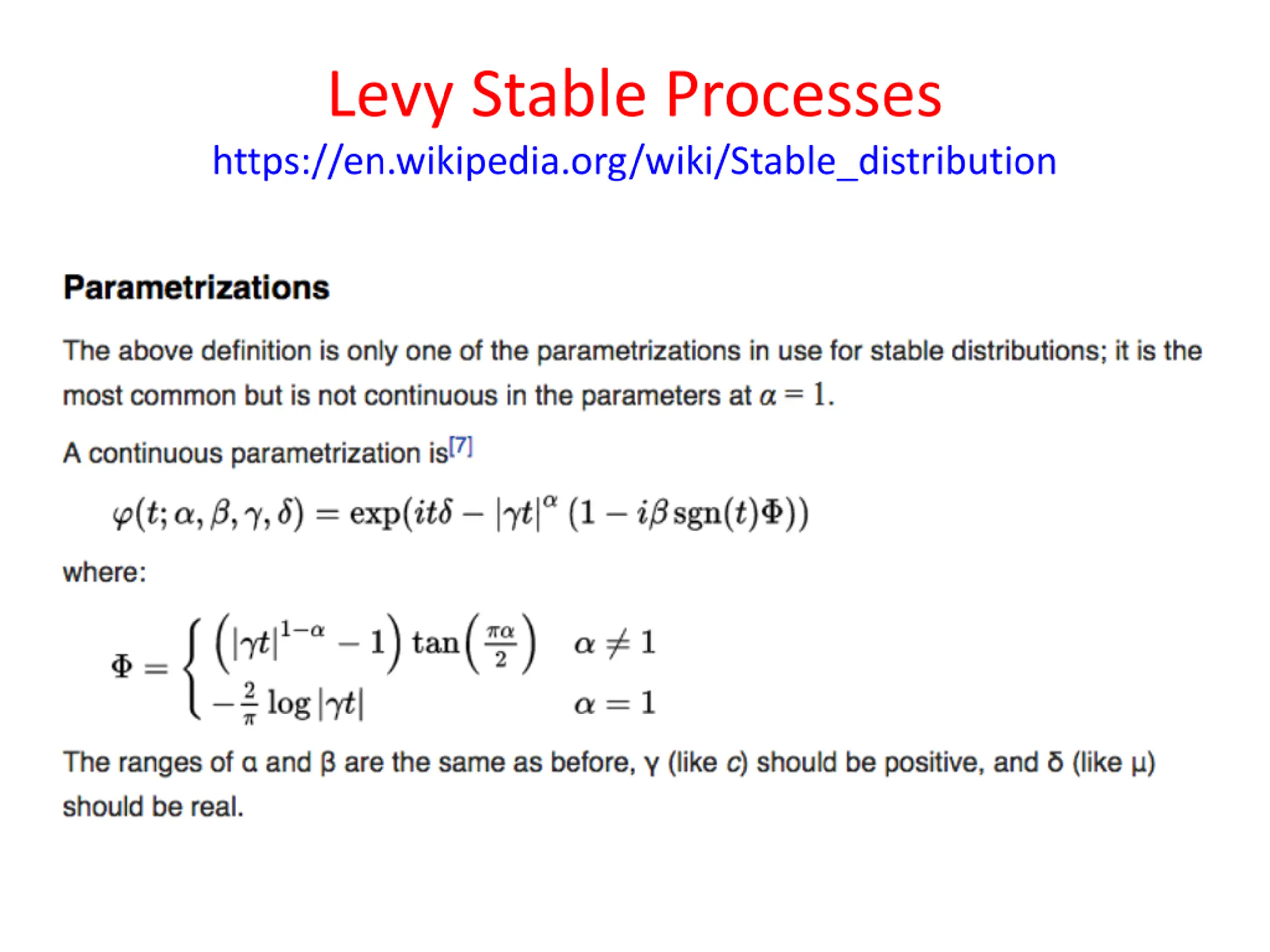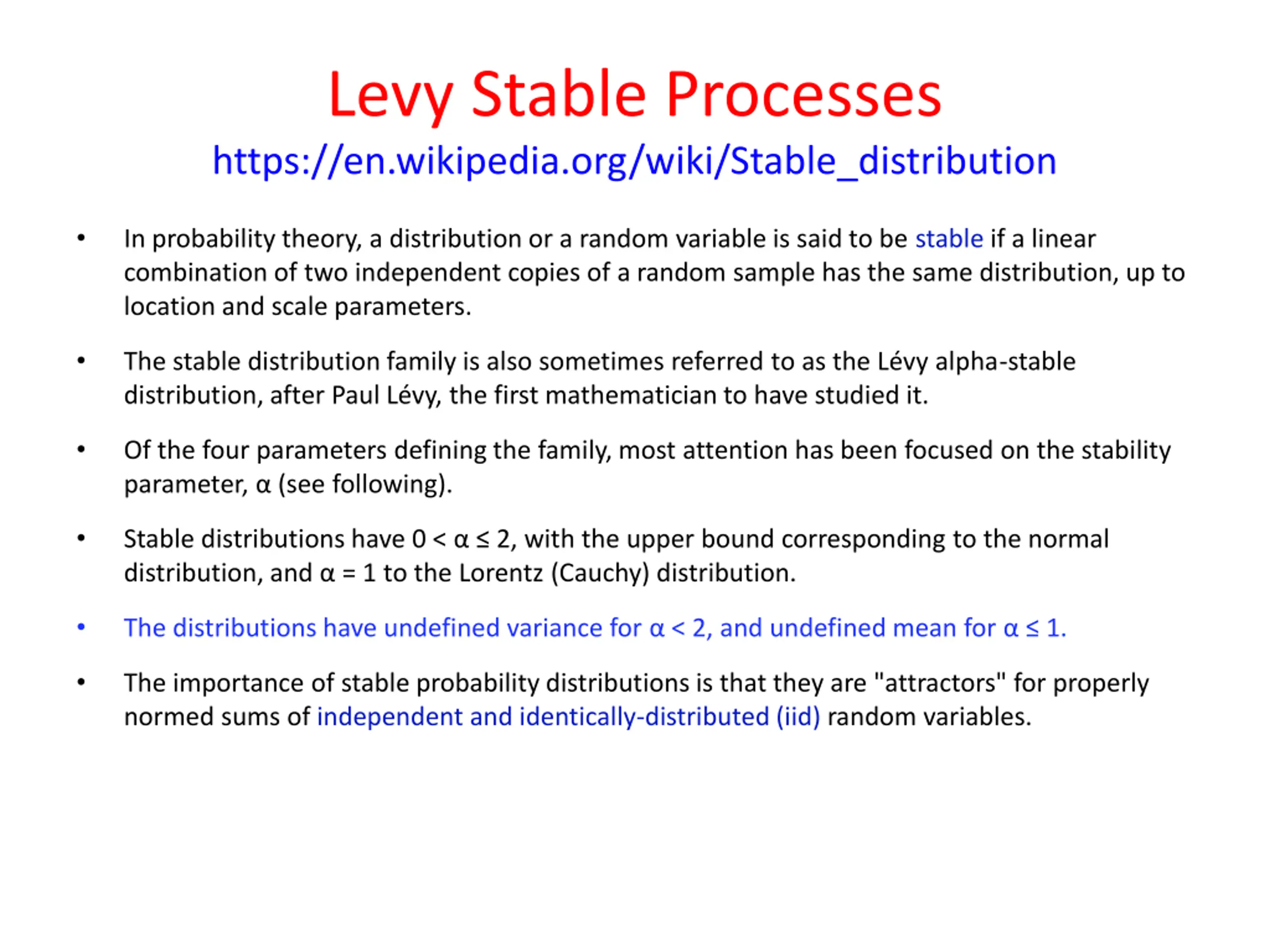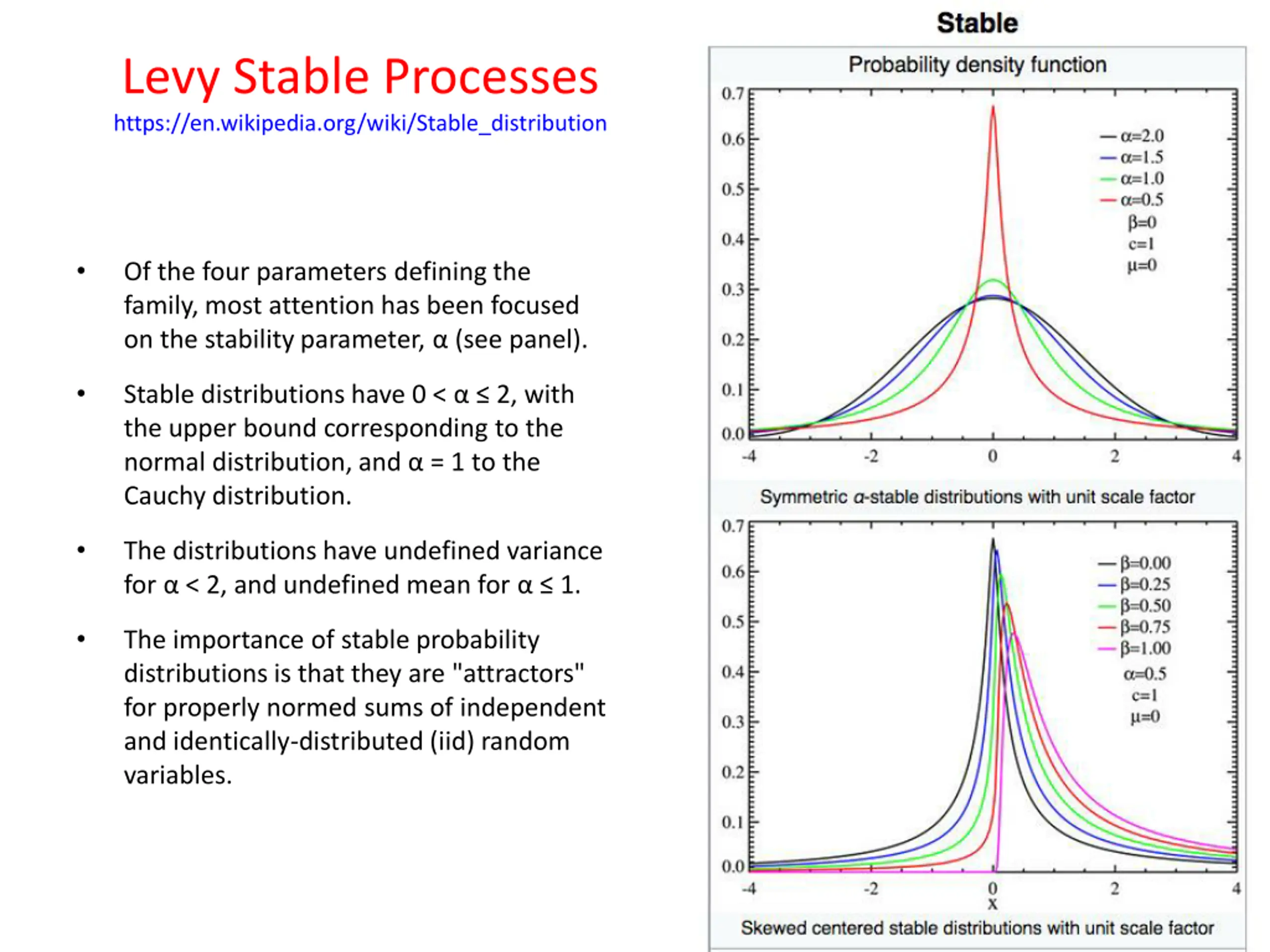 Levy Stable Processes https://en.wikipedia.org/wiki/Stable_distribution Of the four parameters defining the family, most attention has been focused on the stability parameter, (see panel). Stable distributions have 0 < 2, with the upper bound corresponding to the normal distribution, and = 1 to the Cauchy distribution. The distributions have undefined variance for < 2, and undefined mean for 1. The importance of stable probability distributions is that they are "attractors" for properly normed sums of independent and identically-distributed (iid) random variables.