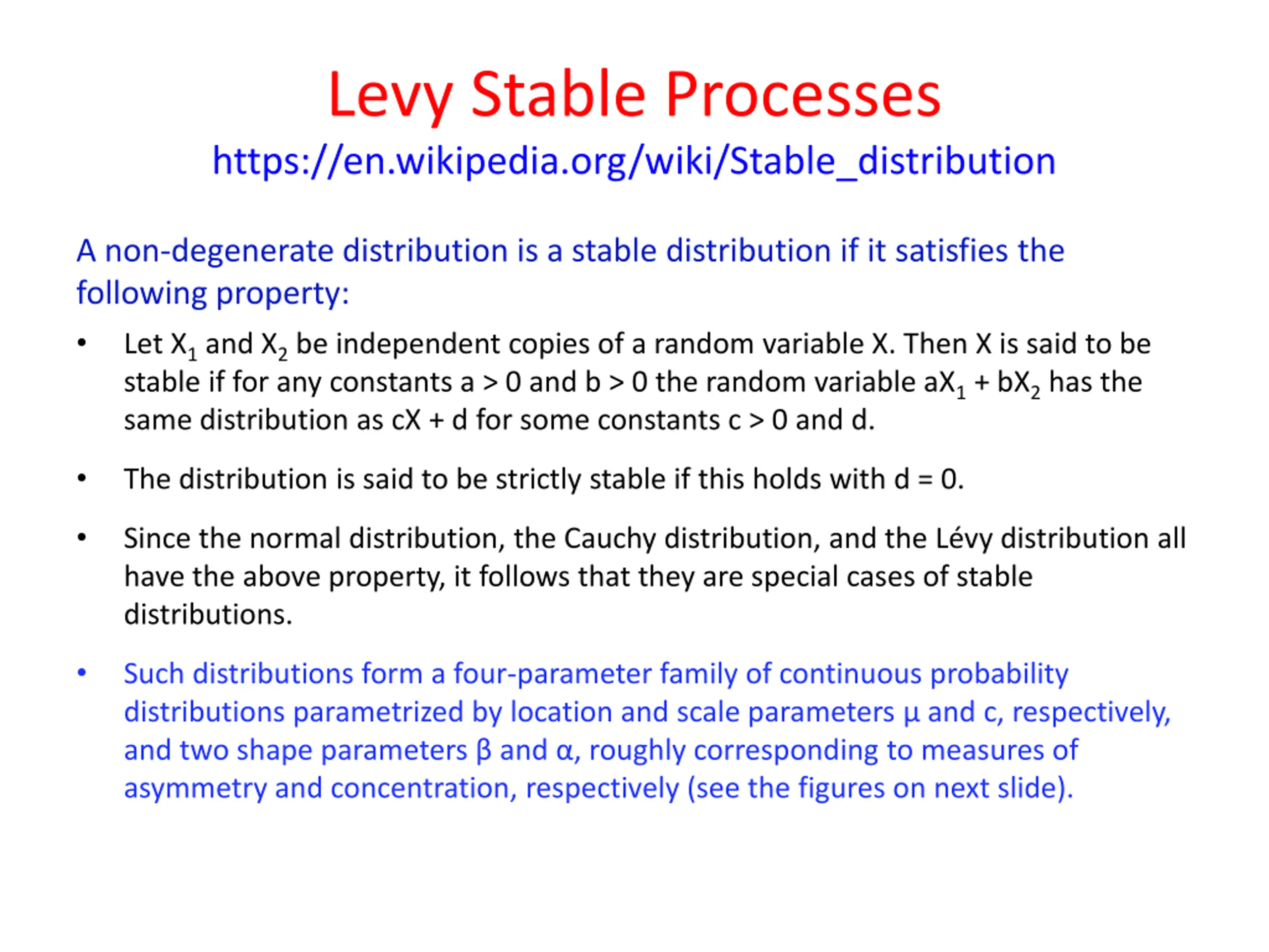 Levy Stable Processes https://en.wikipedia.org/wiki/Stable_distribution A non-degenerate distribution is a stable distribution if it satisfies the following property: Let X1and X2be independent copies of a random variable X. Then X is said to be stable if for any constants a > 0 and b > 0 the random variable aX1+ bX2has the same distribution as cX + d for some constants c > 0 and d. The distribution is said to be strictly stable if this holds with d = 0. Since the normal distribution, the Cauchy distribution, and the L vy distribution all have the above property, it follows that they are special cases of stable distributions. Such distributions form a four-parameter family of continuous probability distributions parametrized by location and scale parameters and c, respectively, and two shape parameters and , roughly corresponding to measures of asymmetry and concentration, respectively (see the figures on next slide).
