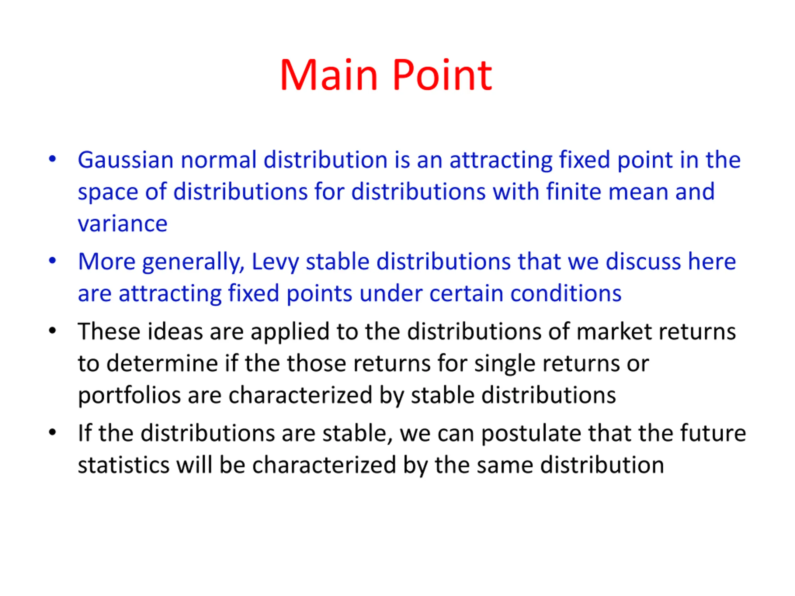 Main Point Gaussian normal distribution is an attracting fixed point in the space of distributions for distributions with finite mean and variance More generally, Levy stable distributions that we discuss here are attracting fixed points under certain conditions These ideas are applied to the distributions of market returns to determine if the those returns for single returns or portfolios are characterized by stable distributions If the distributions are stable, we can postulate that the future statistics will be characterized by the same distribution