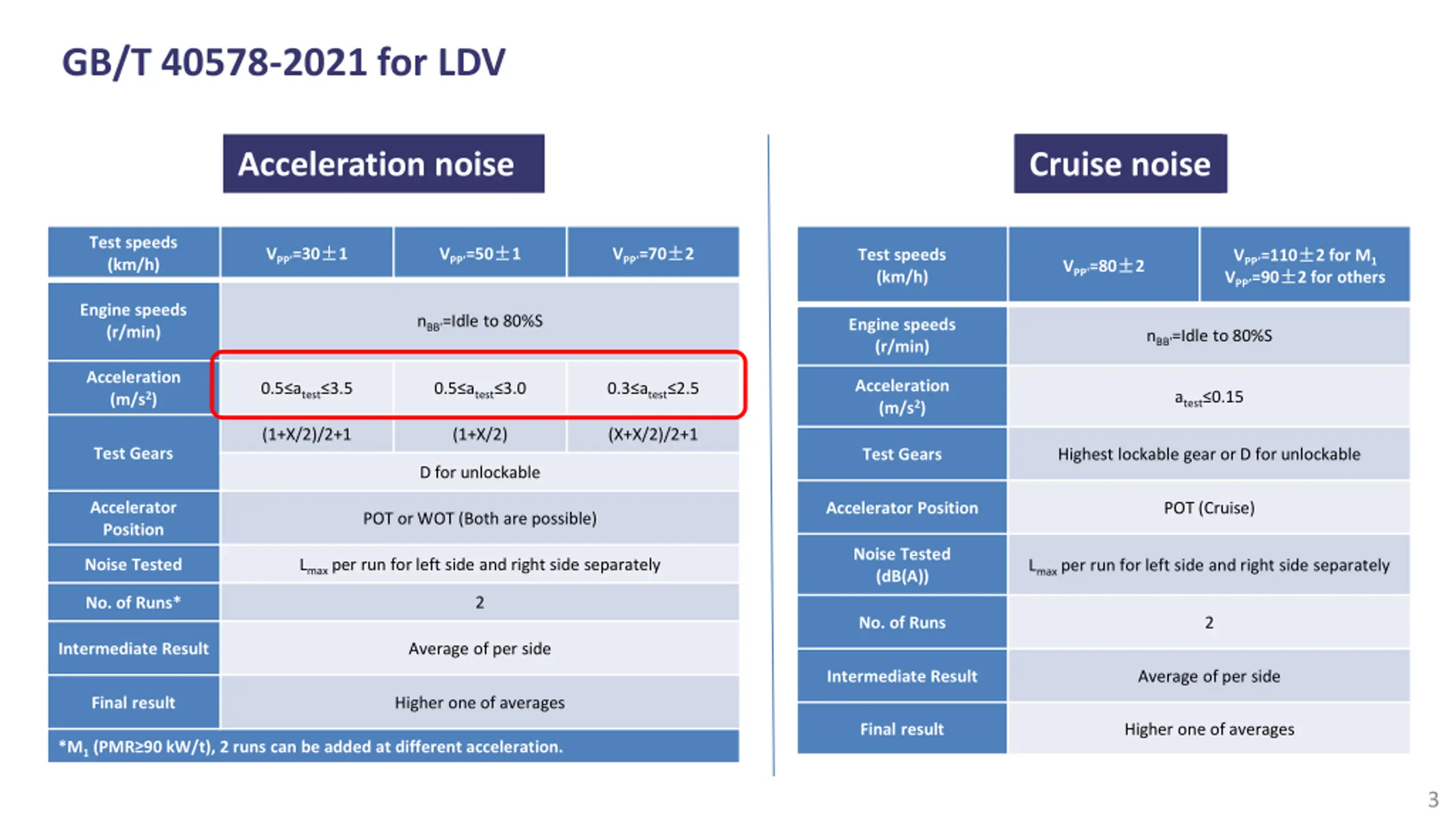 GB/T 40578-2021 for LDV Acceleration noise cruise noise Cruise noise Test speeds (km/h) VPP'=30 1 VPP'=50 1 VPP'=70 2 VPP =110 VPP =90 2 for M1 2 for others Test speeds (km/h) VPP'=80 2 Engine speeds (r/min) nBB'=Idle to 80%S Engine speeds (r/min) nBB'=Idle to 80%S Acceleration (m/s2) Acceleration (m/s2) 0.5 atest 3.5 0.5 atest 3.0 0.3 atest 2.5 atest 0.15 (1+X/2)/2+1 (1+X/2) (X+X/2)/2+1 Test Gears Test Gears Highest lockable gear or D for unlockable D for unlockable Accelerator Position Accelerator Position POT (Cruise) POT or WOT (Both are possible) Noise Tested (dB(A)) Noise Tested Lmaxper run for left side and right side separately Lmaxper run for left side and right side separately 2 No. of Runs* No. of Runs 2 Intermediate Result Average of per side Intermediate Result Average of per side Final result Higher one of averages Final result Higher one of averages *M1(PMR 90 kW/t), 2 runs can be added at different acceleration. 3