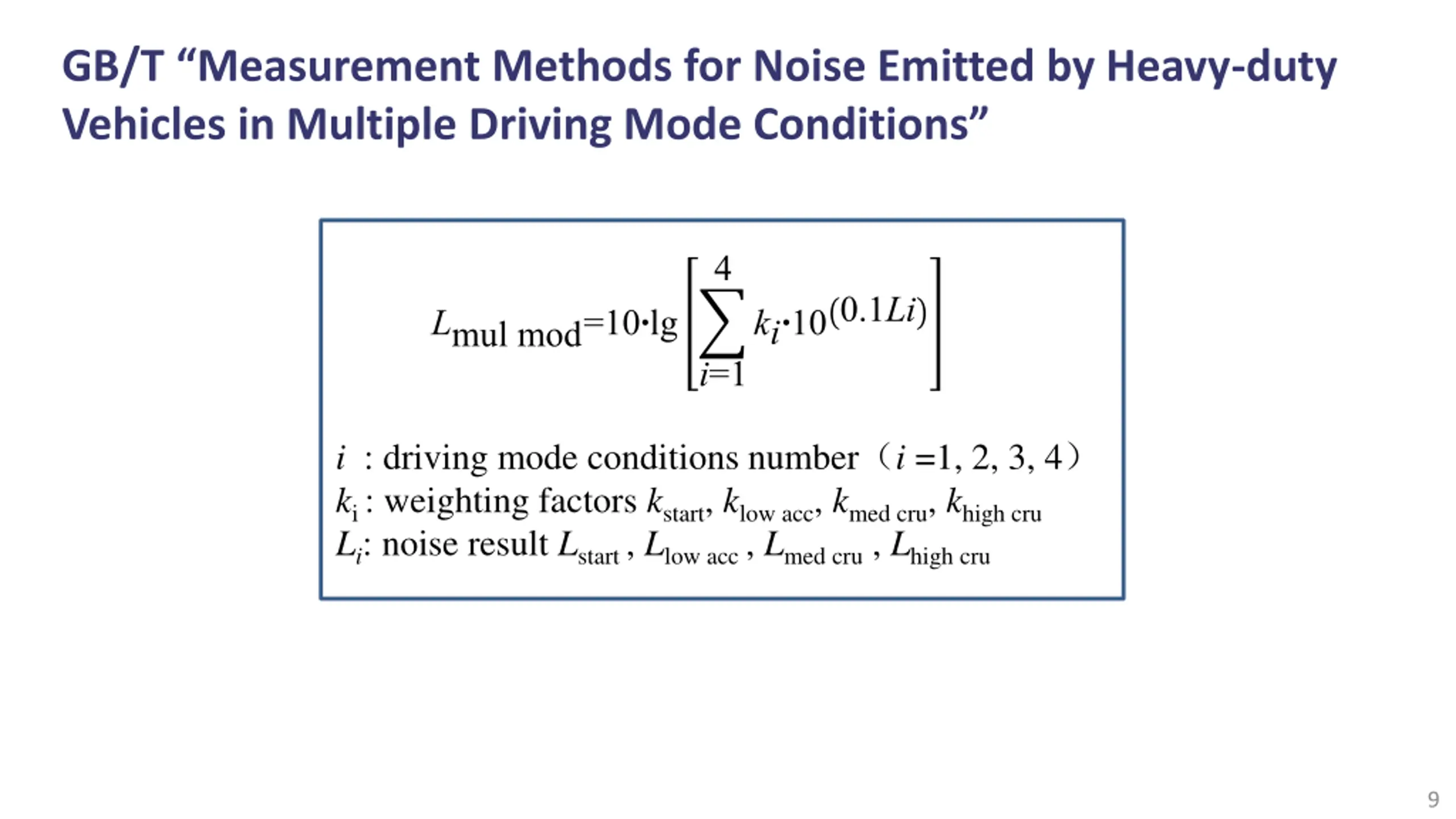 GB/T Measurement Methods for Noise Emitted by Heavy-duty Vehicles in Multiple Driving Mode Conditions 4 ki 100.1Li Lmul mod=10 lg i=1 i : driving mode conditions number i =1, 2, 3, 4 ki : weighting factors kstart, klow acc, kmed cru, khigh cru Li: noise result Lstart , Llow acc , Lmed cru, Lhigh cru 9