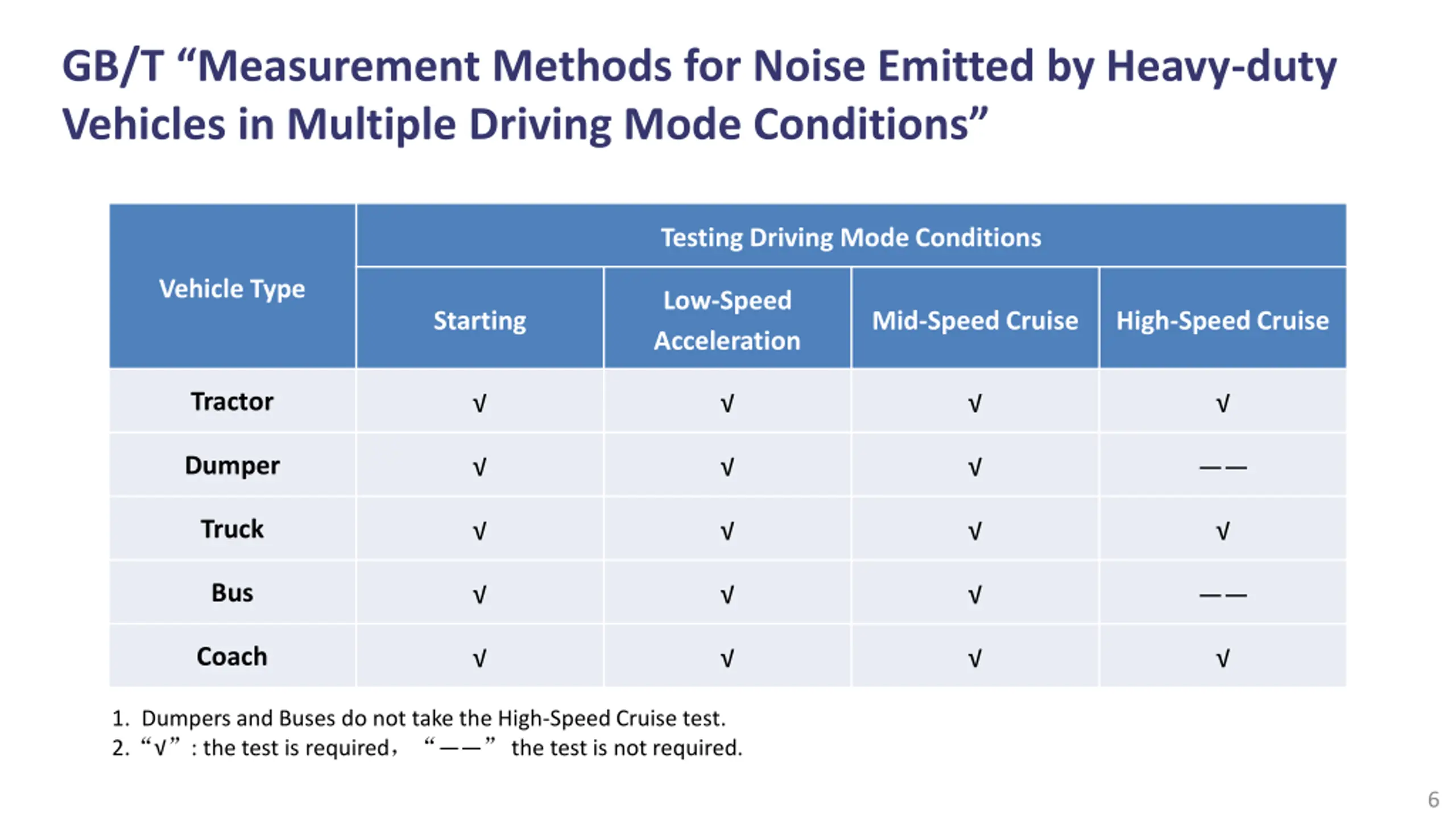 GB/T Measurement Methods for Noise Emitted by Heavy-duty Vehicles in Multiple Driving Mode Conditions Testing Driving Mode Conditions Vehicle Type Low-Speed Acceleration Starting Mid-Speed Cruise High-Speed Cruise Tractor Dumper Truck Bus Coach 1. Dumpers and Buses do not take the High-SpeedCruise test. 2. : the test is required the test is not required. 6