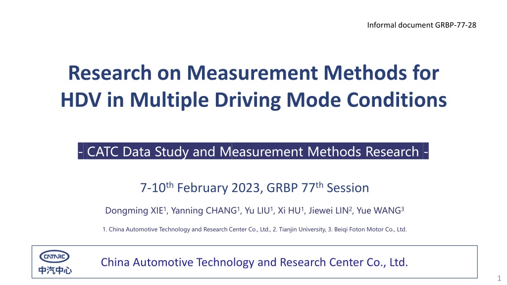 Informal document GRBP-77-28 Research on Measurement Methods for HDV in Multiple Driving Mode Conditions - CATC Data Study and Measurement Methods Research - 7-10thFebruary 2023, GRBP 77thSession Dongming XIE1, Yanning CHANG1, Yu LIU1, Xi HU1, Jiewei LIN2, Yue WANG3 1. China Automotive Technology and Research Center Co., Ltd., 2. Tianjin University, 3. Beiqi Foton Motor Co., Ltd. China Automotive Technology and Research Center Co., Ltd. 1