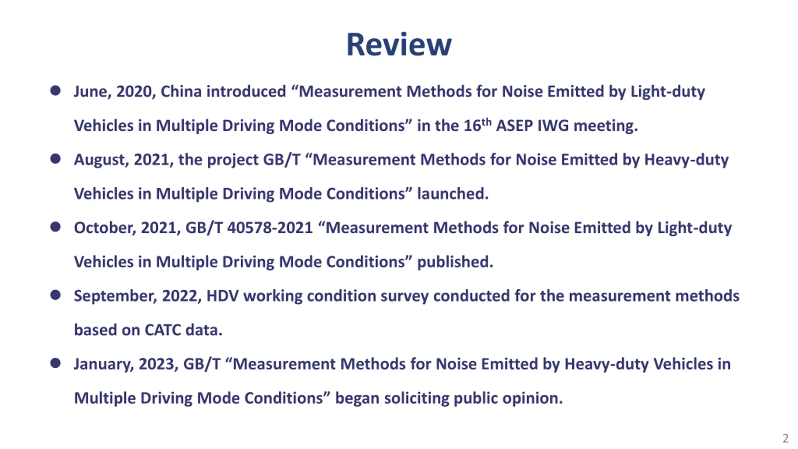 Review June, 2020, China introduced Measurement Methods for Noise Emitted by Light-duty Vehicles in Multiple Driving Mode Conditions in the 16thASEP IWG meeting. August, 2021, the project GB/T Measurement Methods for Noise Emitted by Heavy-duty Vehicles in Multiple Driving Mode Conditions launched. October, 2021, GB/T 40578-2021 Measurement Methods for Noise Emitted by Light-duty Vehicles in Multiple Driving Mode Conditions published. September, 2022, HDV working condition survey conducted for the measurement methods based on CATC data. January, 2023, GB/T Measurement Methods for Noise Emitted by Heavy-duty Vehicles in Multiple Driving Mode Conditions began soliciting public opinion. 2