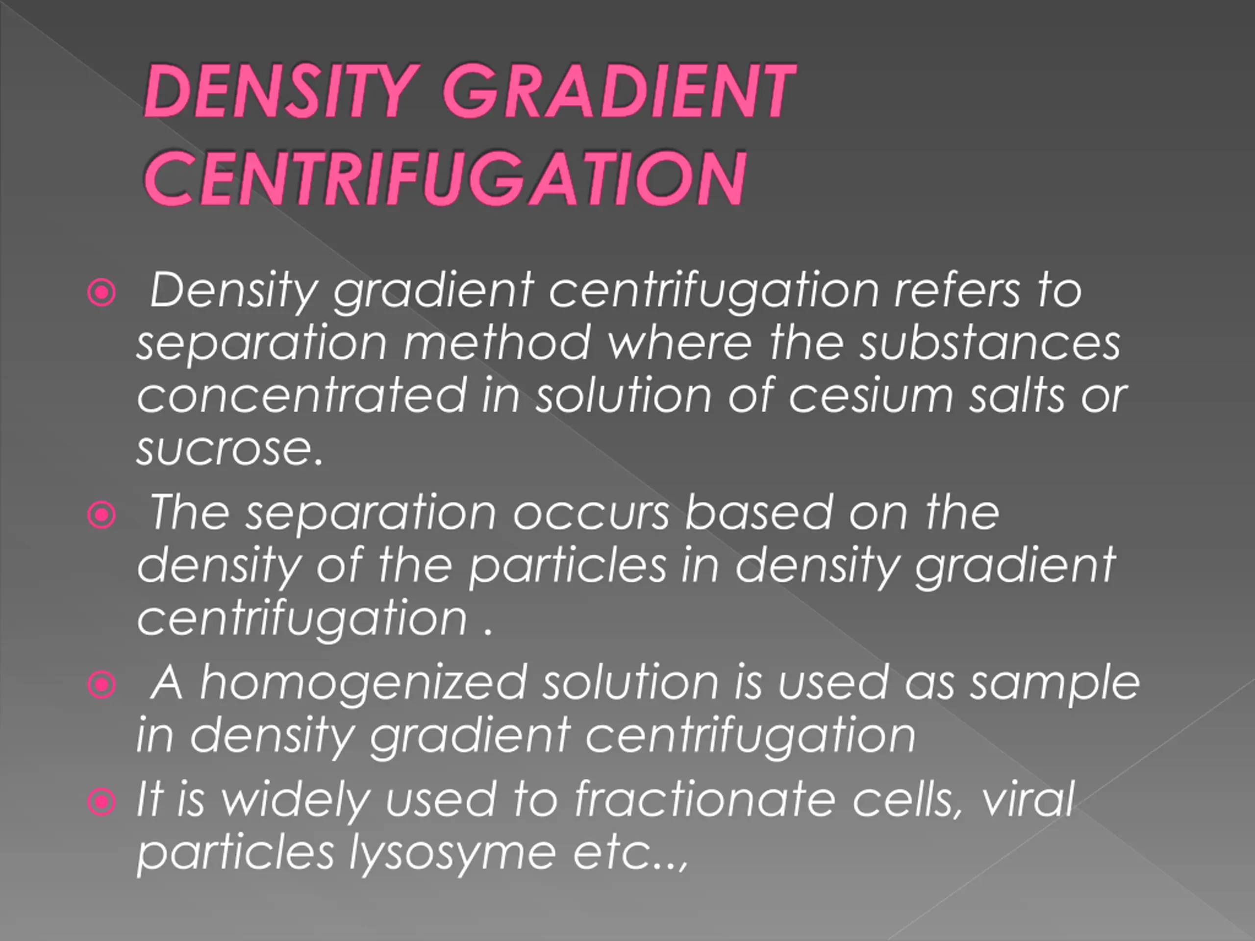 DENSITY GRADIENT CENTRIFUGATION Density gradient centrifugation refers to separation method where the substances concentrated in solution of cesium salts or sucrose. The separation occurs based on the density of the particles in density gradient centrifugation . A homogenized solution is used as sample in density gradient centrifugation It is widely used to fractionate cells, viral particles lysosyme etc..,