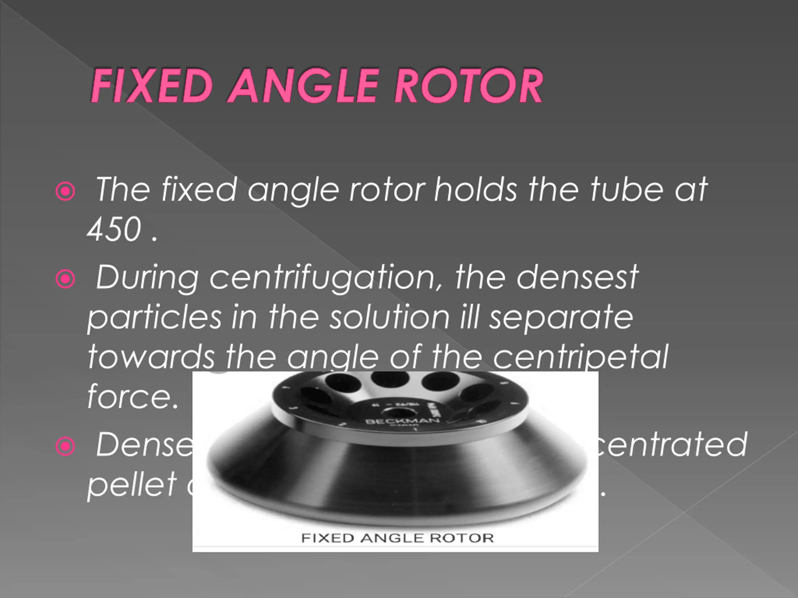FIXED ANGLE ROTOR The fixed angle rotor holds the tube at 450 . During centrifugation, the densest particles in the solution ill separate towards the angle of the centripetal force. Dense particles will form a concentrated pellet at the bottom of the tube.
