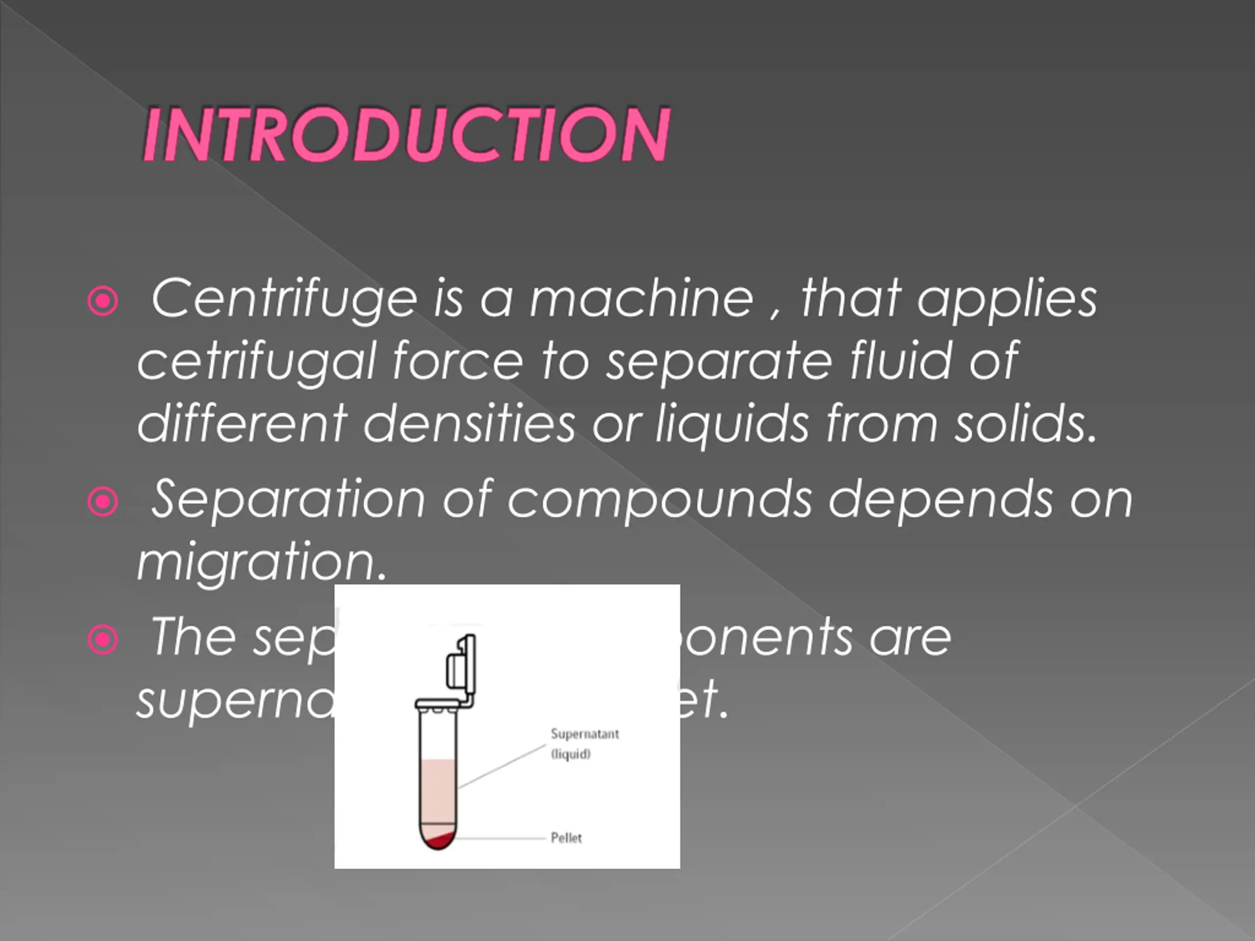 INTRODUCTION Centrifuge is a machine , that applies cetrifugal force to separate fluid of different densities or liquids from solids. Separation of compounds depends on migration. The separated components are supernatant and pellet.