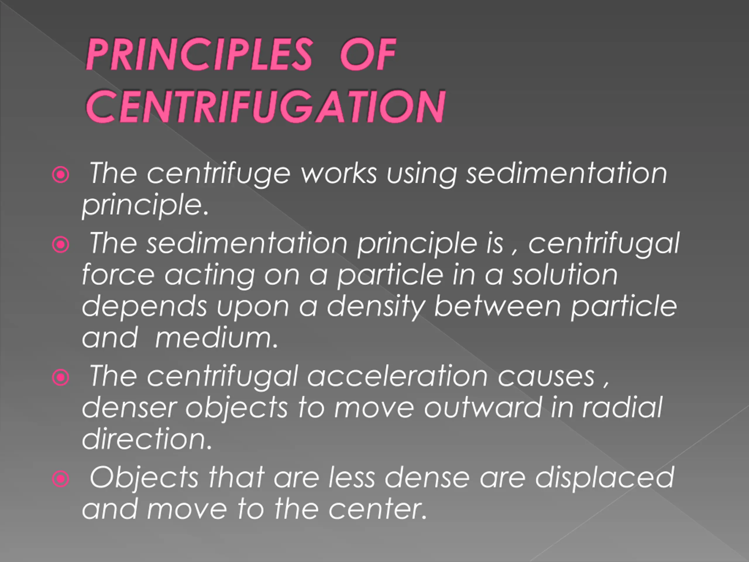 PRINCIPLES OF CENTRIFUGATION The centrifuge works using sedimentation principle. The sedimentation principle is , centrifugal force acting on a particle in a solution depends upon a density between particle and medium. The centrifugal acceleration causes , denser objects to move outward in radial direction. Objects that are less dense are displaced and move to the center.